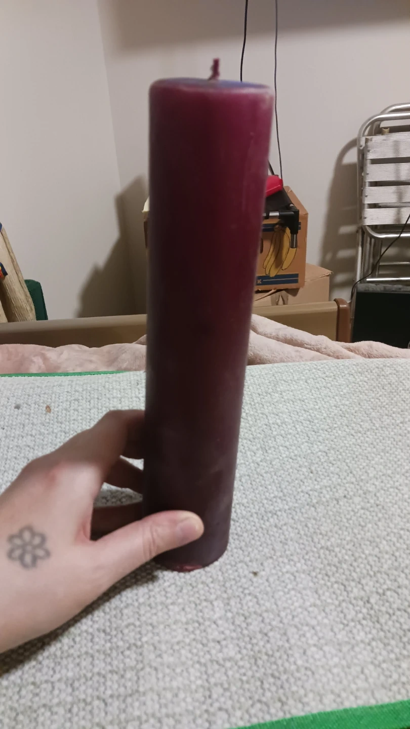 This is a large, pillar-style candle with a deep burgundy colour. It's designed for long-lasting burn time. Perfect for creating ambiance in any room. Unscented and smoke free!