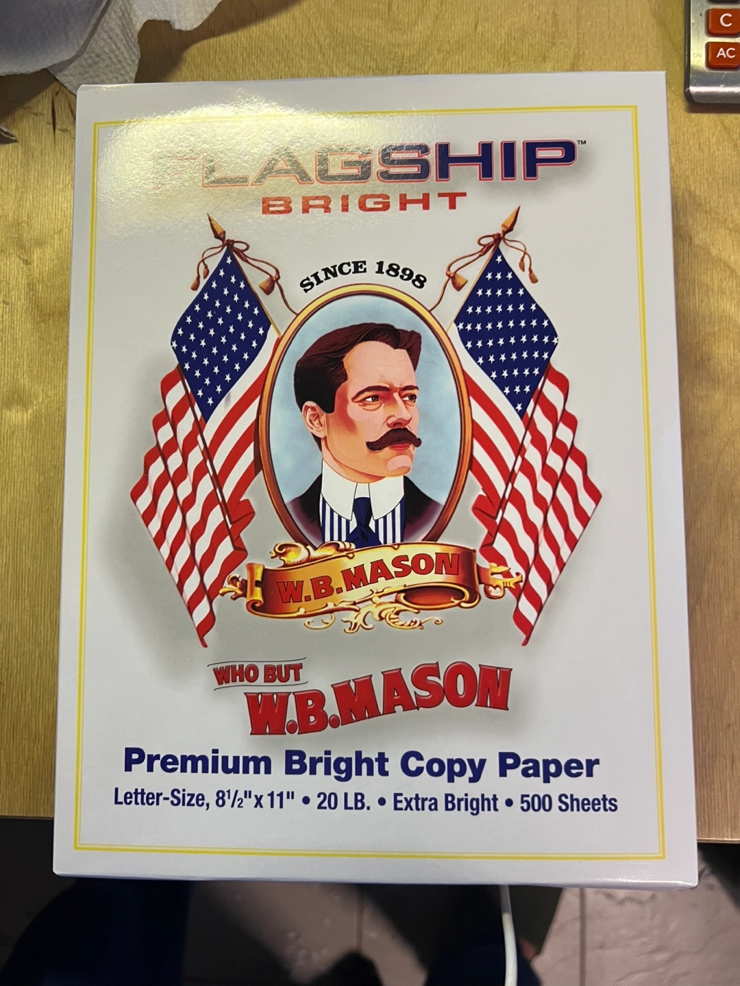 Selling a pack of W.B. Mason Premium Bright Copy Paper. This is letter-size, 8 1/2" x 11", and weighs 20 LB. It comes with 500 sheets and is extra bright! Have more if needed.