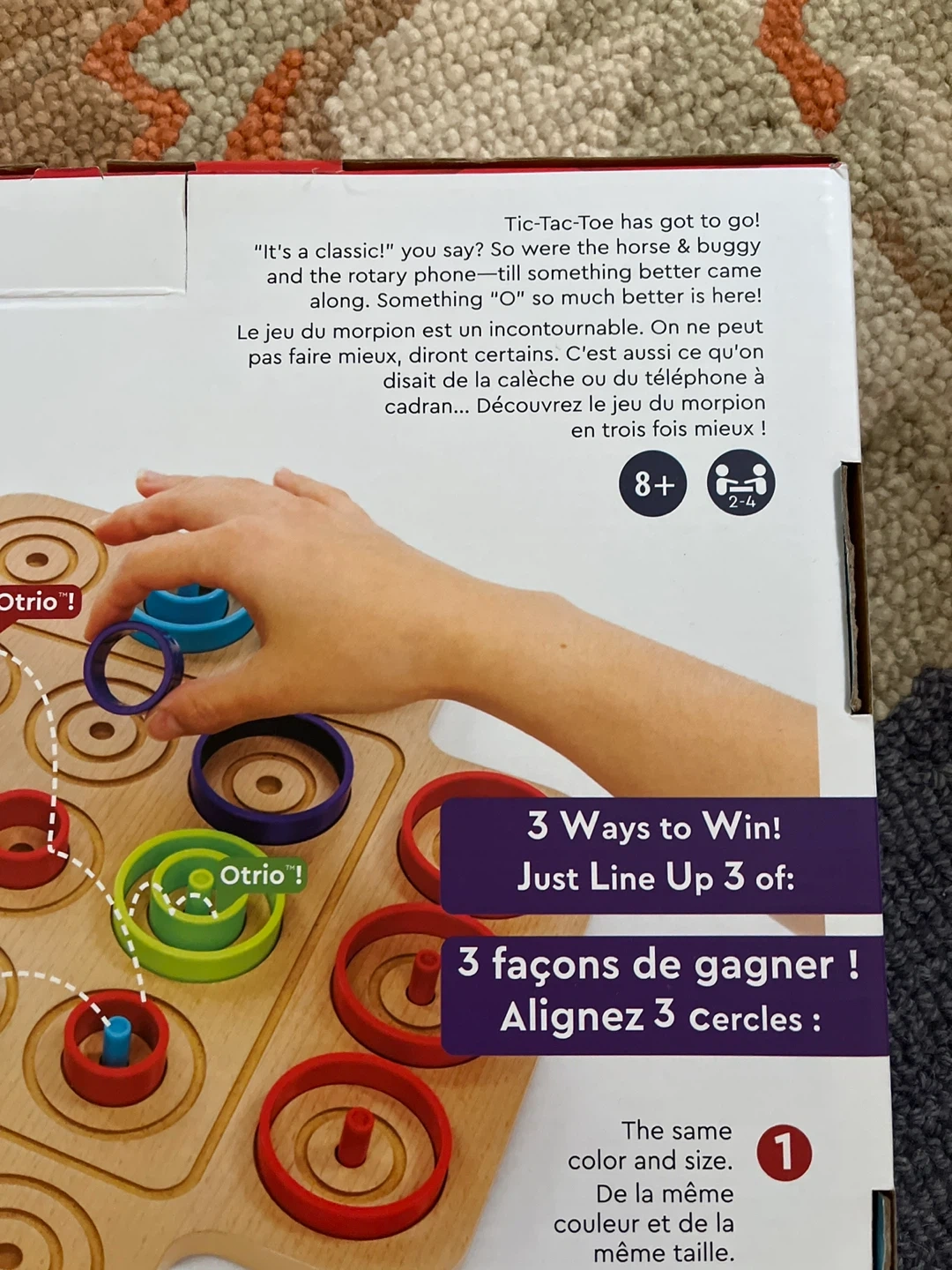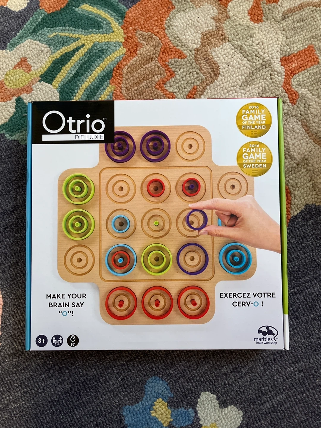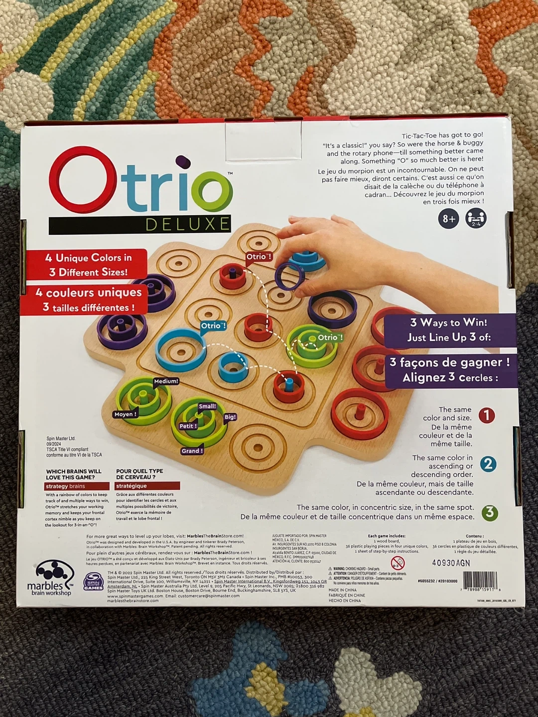 Otrio Deluxe is a strategy board game. It comes with a wooden board and 4 unique colors in 3 different sizes. For ages 8 and up!