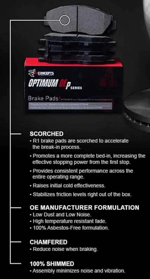 5Brand New, sealed A set of two pairs for front left and right brake Brand: R1 Concepts Width 155 - 157 mm Thickness 19mm Height 64 - 69 mm Low Dust & Noise: Brake pads come with shims to eliminate noise. Low dust, asbestos free OEp formulation provides excellent fade resistance. Top choice for brake pads replacement. Compatibility: CLK 320 Base 98-02 CLK 330 Base 99-03 E320 Base 00-02 E320 4matic 04-05 E350 4matic 06-09 E430 base 98-01 SLK 320 base 01-04
