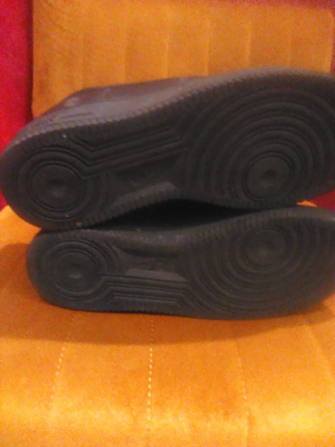 These are black Nike Air Force 1 Low sneakers. They feature a leather upper and rubber sole. Classic athletic shoes for everyday wear.