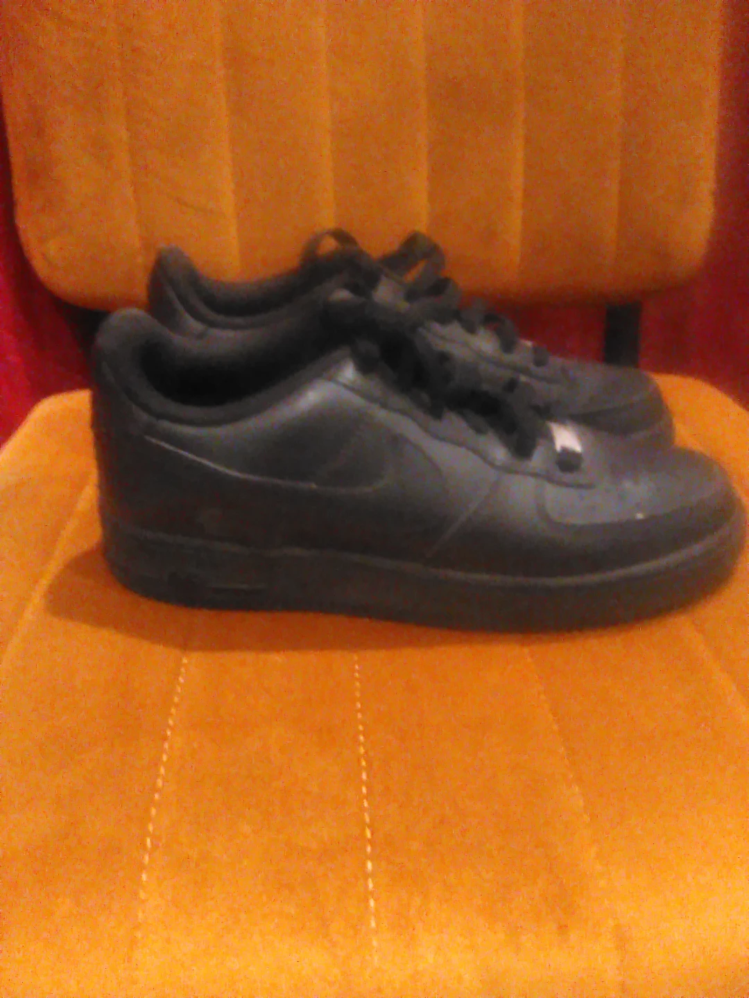 These are black Nike Air Force 1 Low sneakers. They feature a leather upper and rubber sole. Classic athletic shoes for everyday wear.