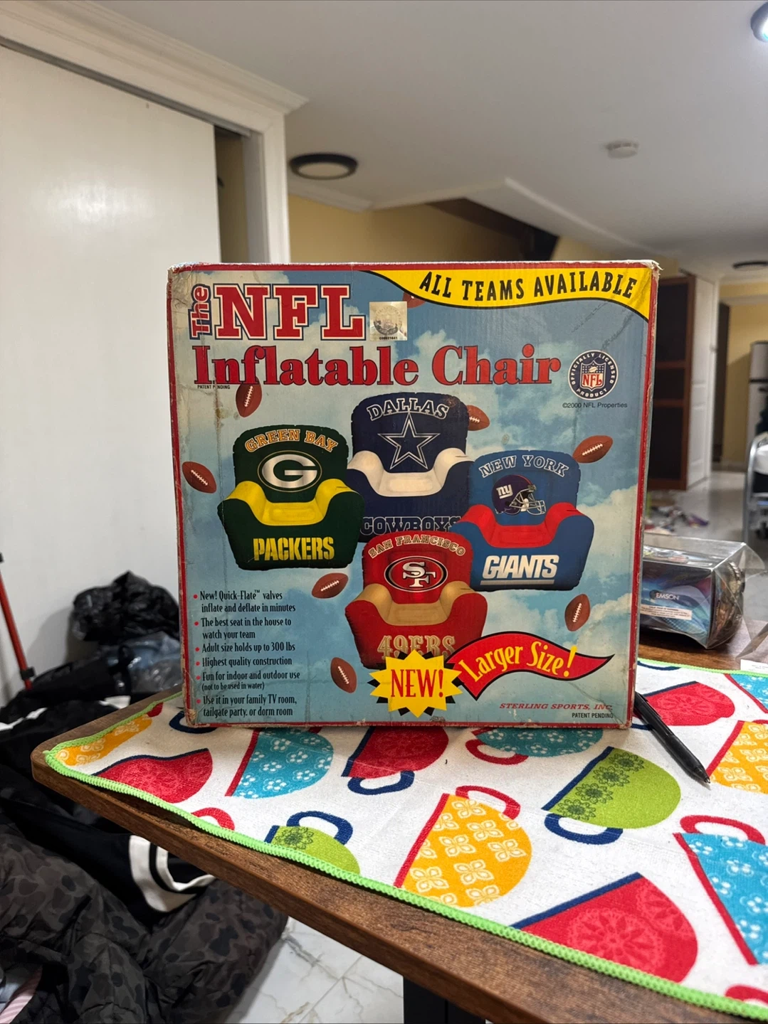 This is an NFL inflatable chair with a larger size. It features quick inflate/deflate valves and holds up to 300 lbs. It's suitable for indoor and outdoor use. Great for your family room, tailgate parties, or dorm room!