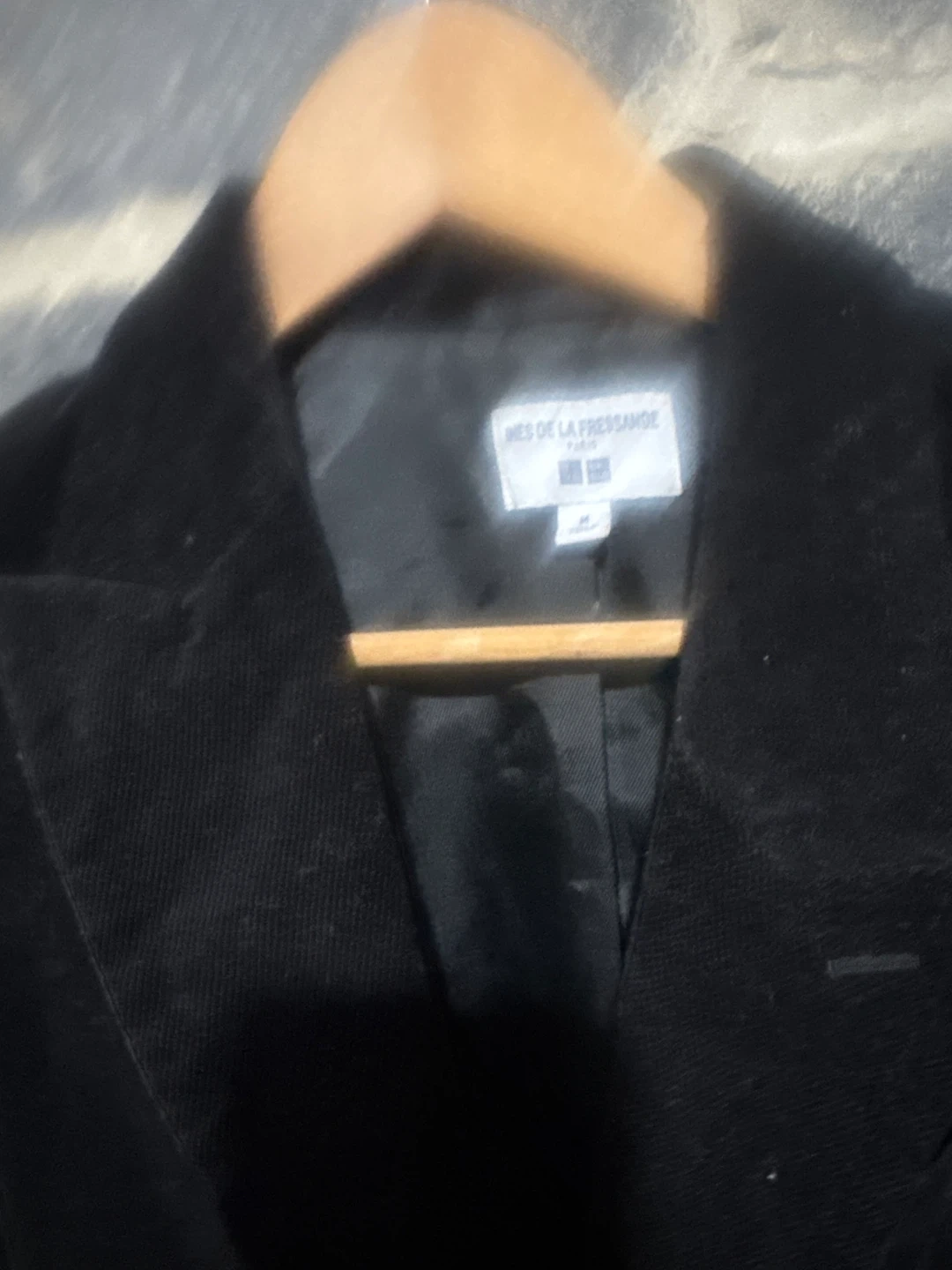 Classic black velvet blazer from the INES DE LA FRESSANGE Paris x UNIQLO collaboration. It's a stylish piece with a notched lapel and two front pockets. This blazer is made of a soft velvet