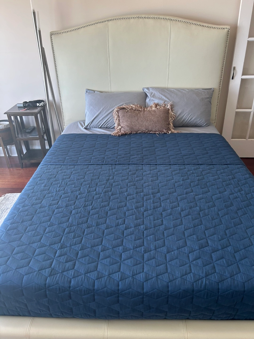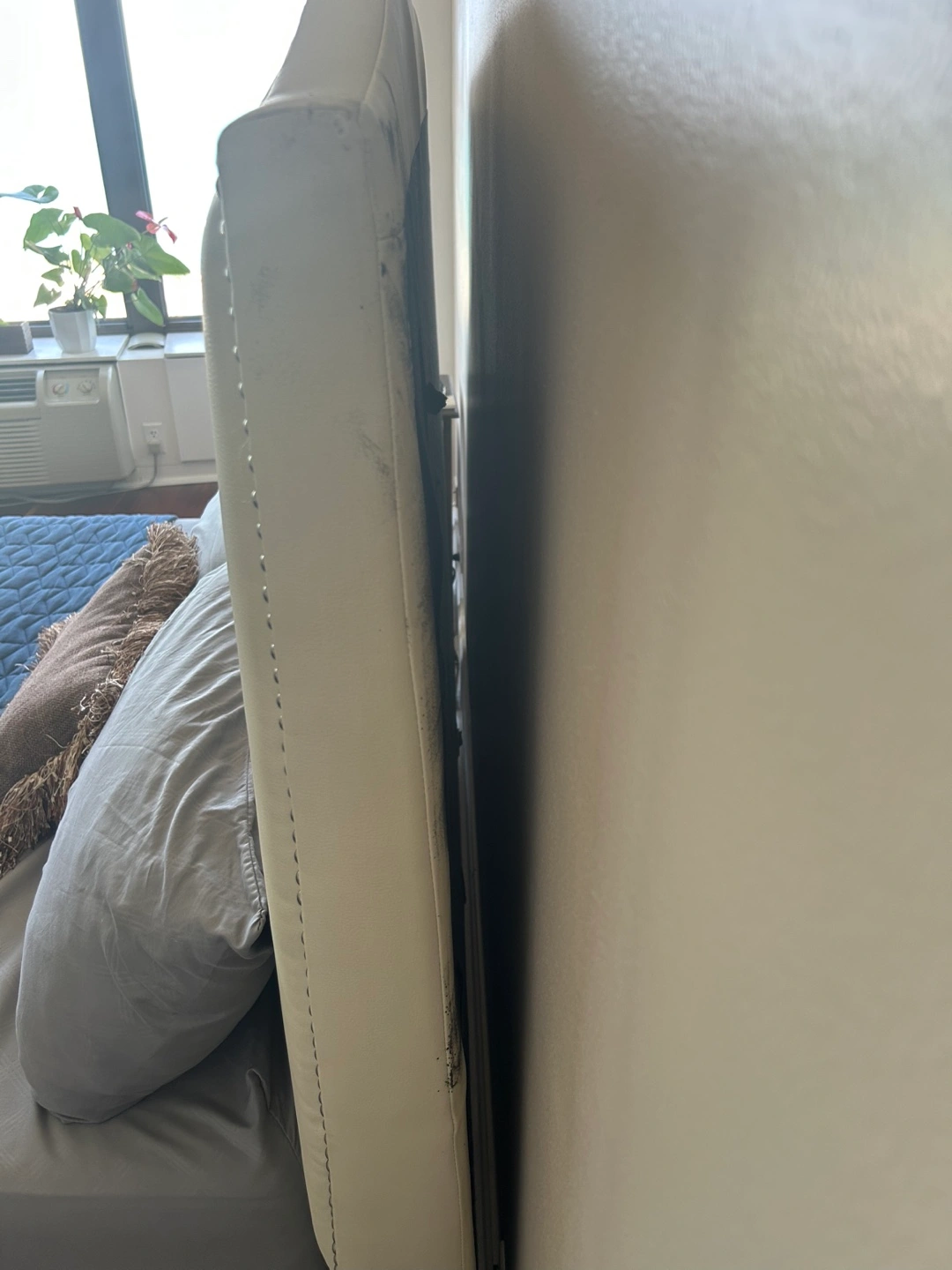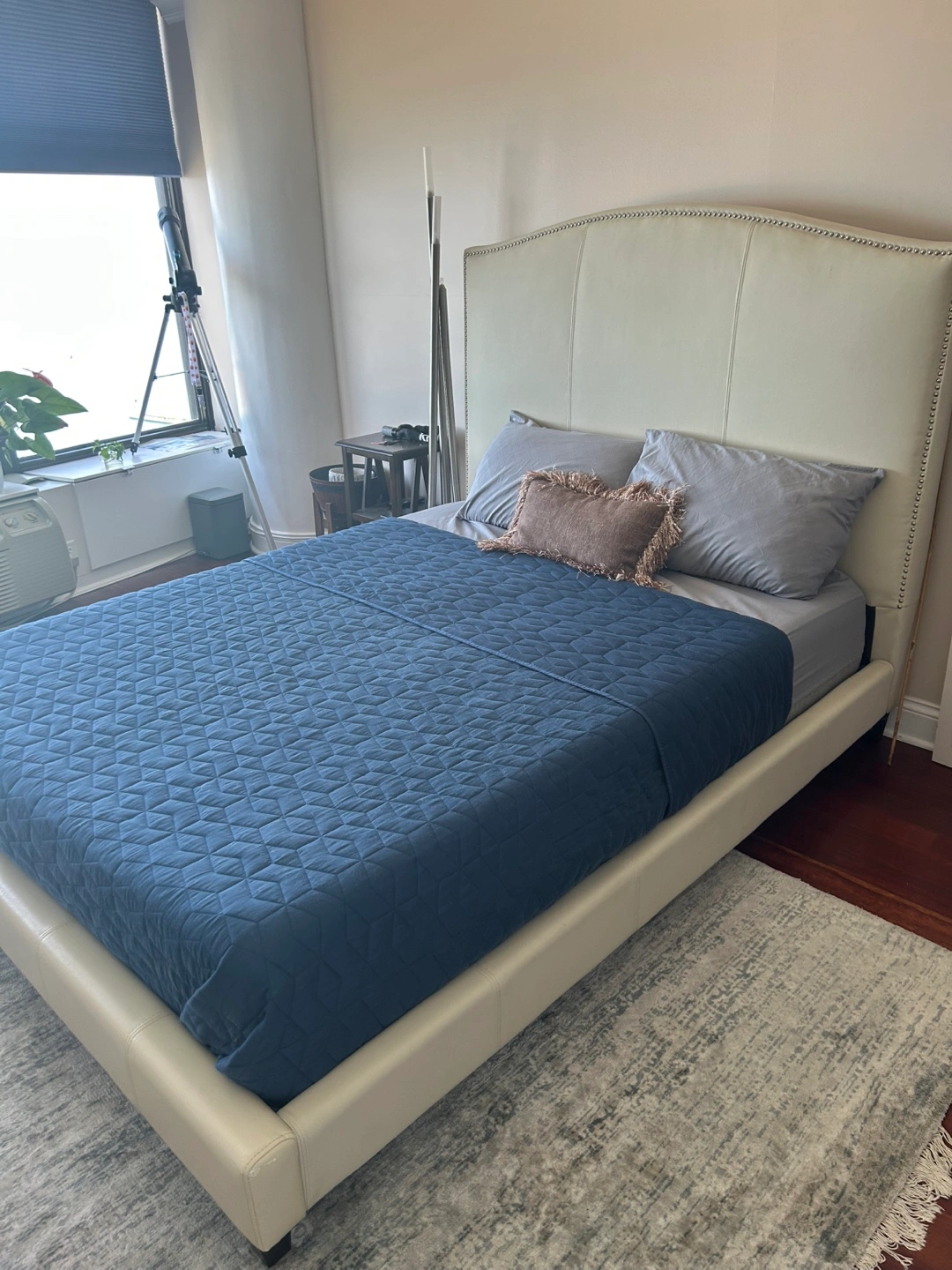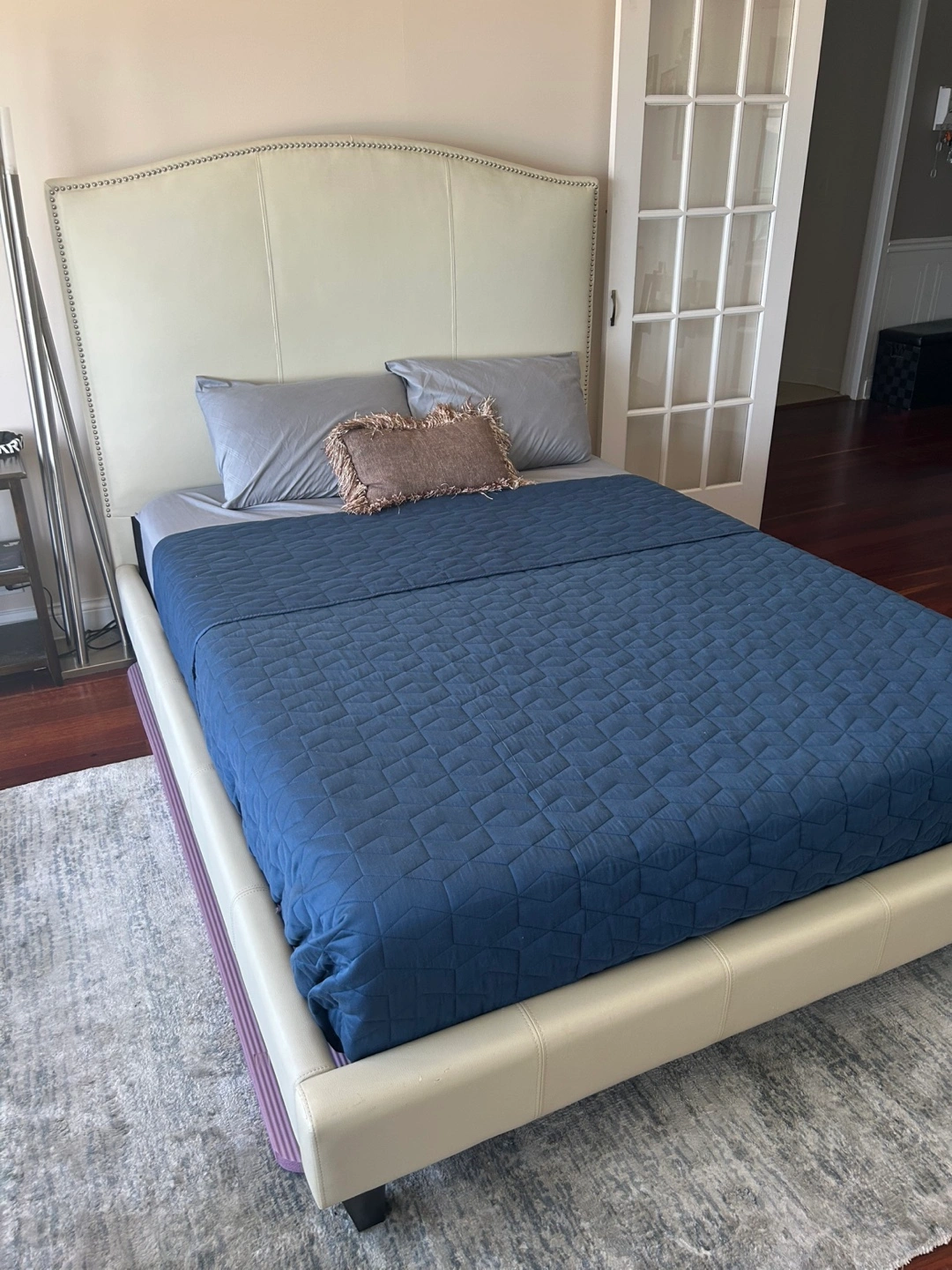 Queen size bed frame. Off-white leather headboard with nailhead trim. Low profile platform bed. Some minor discoloration on the headboard.