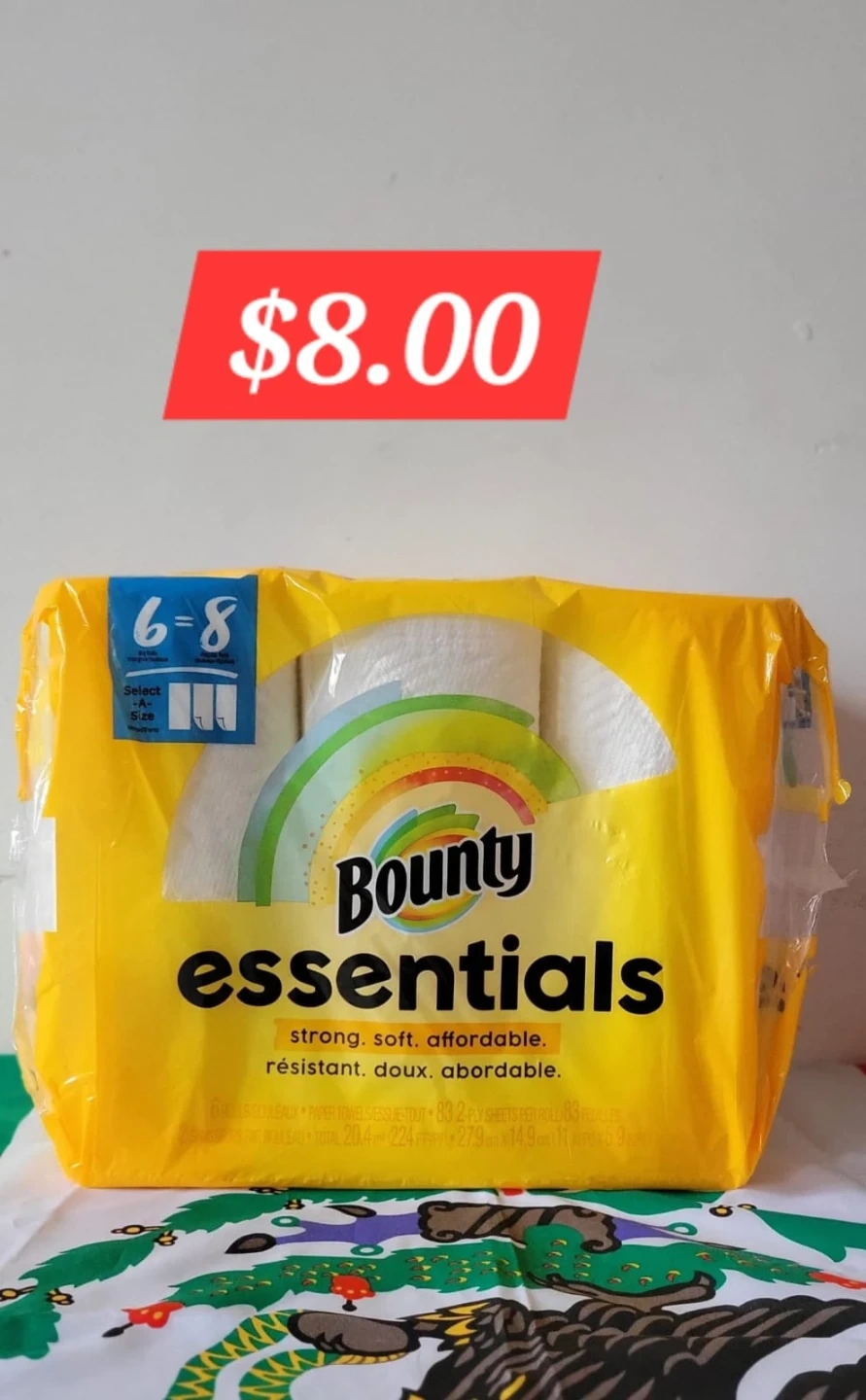 This package contains Bounty Essentials paper towels. It's a Select-A-Size product with 6-8 rolls. Each roll has 83 2-ply sheets.