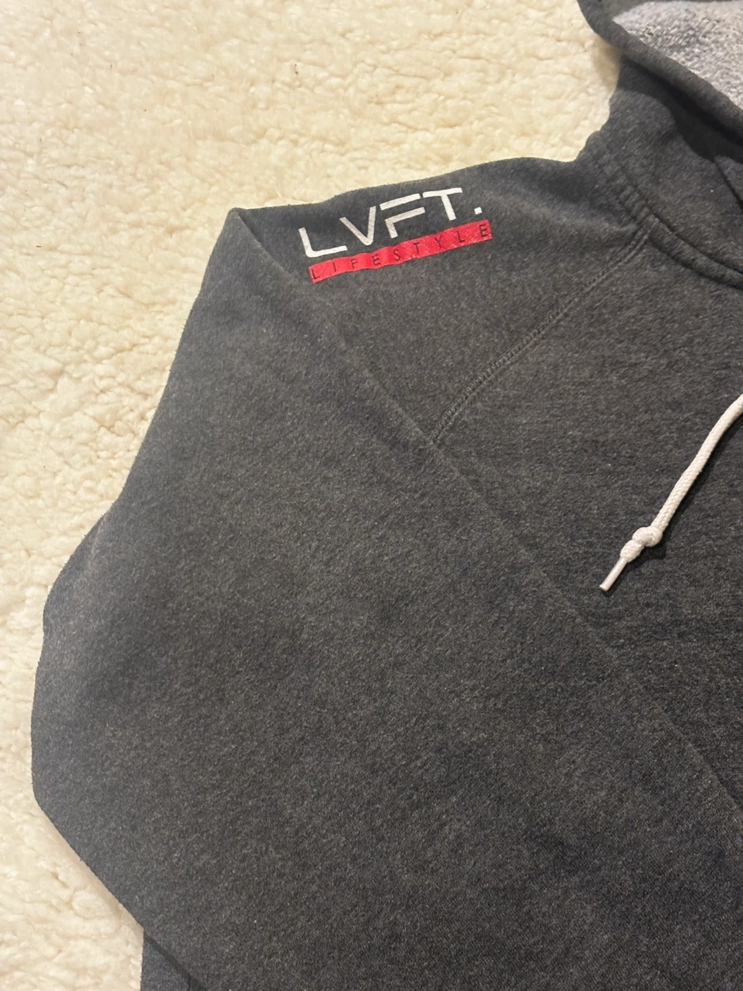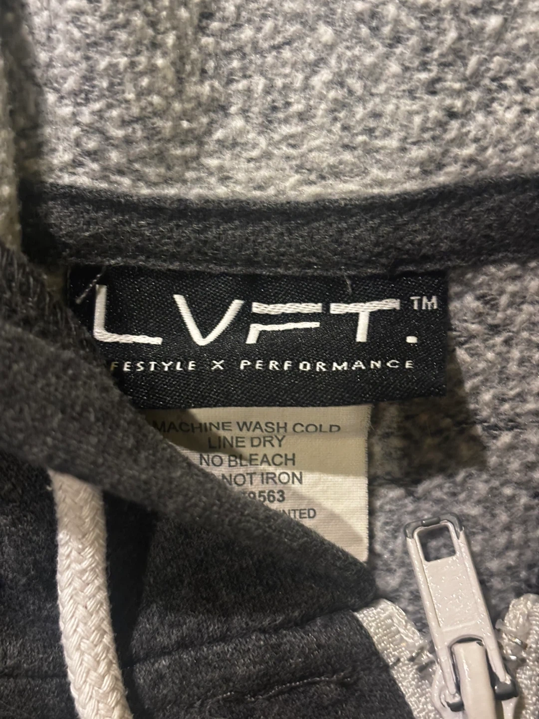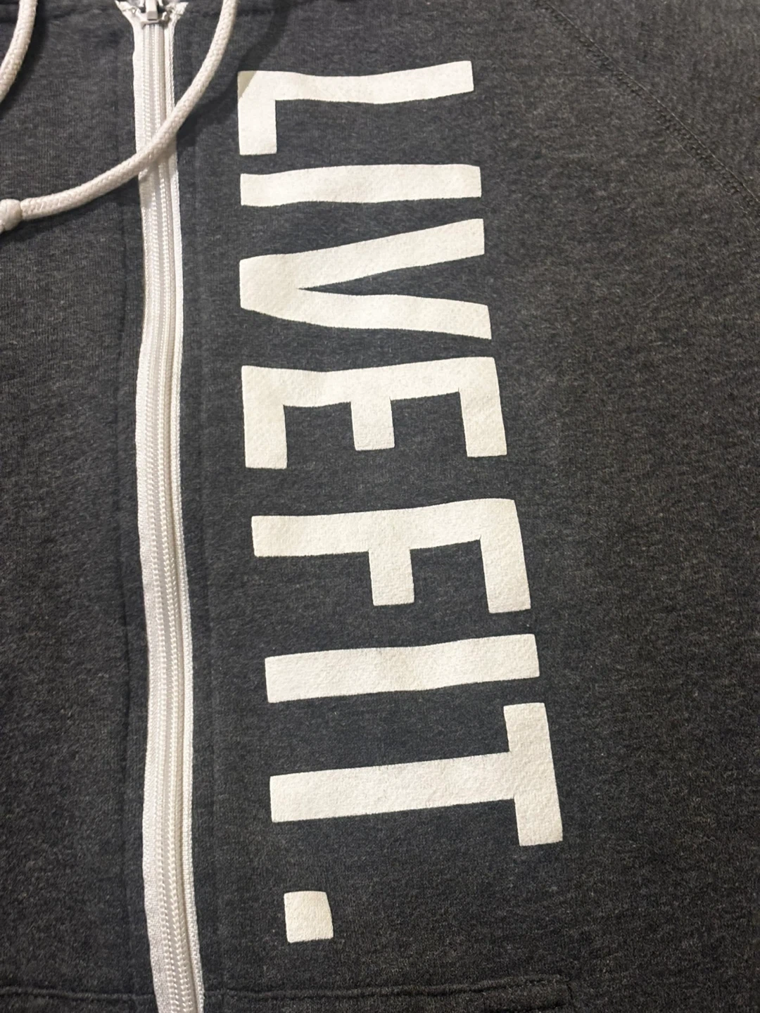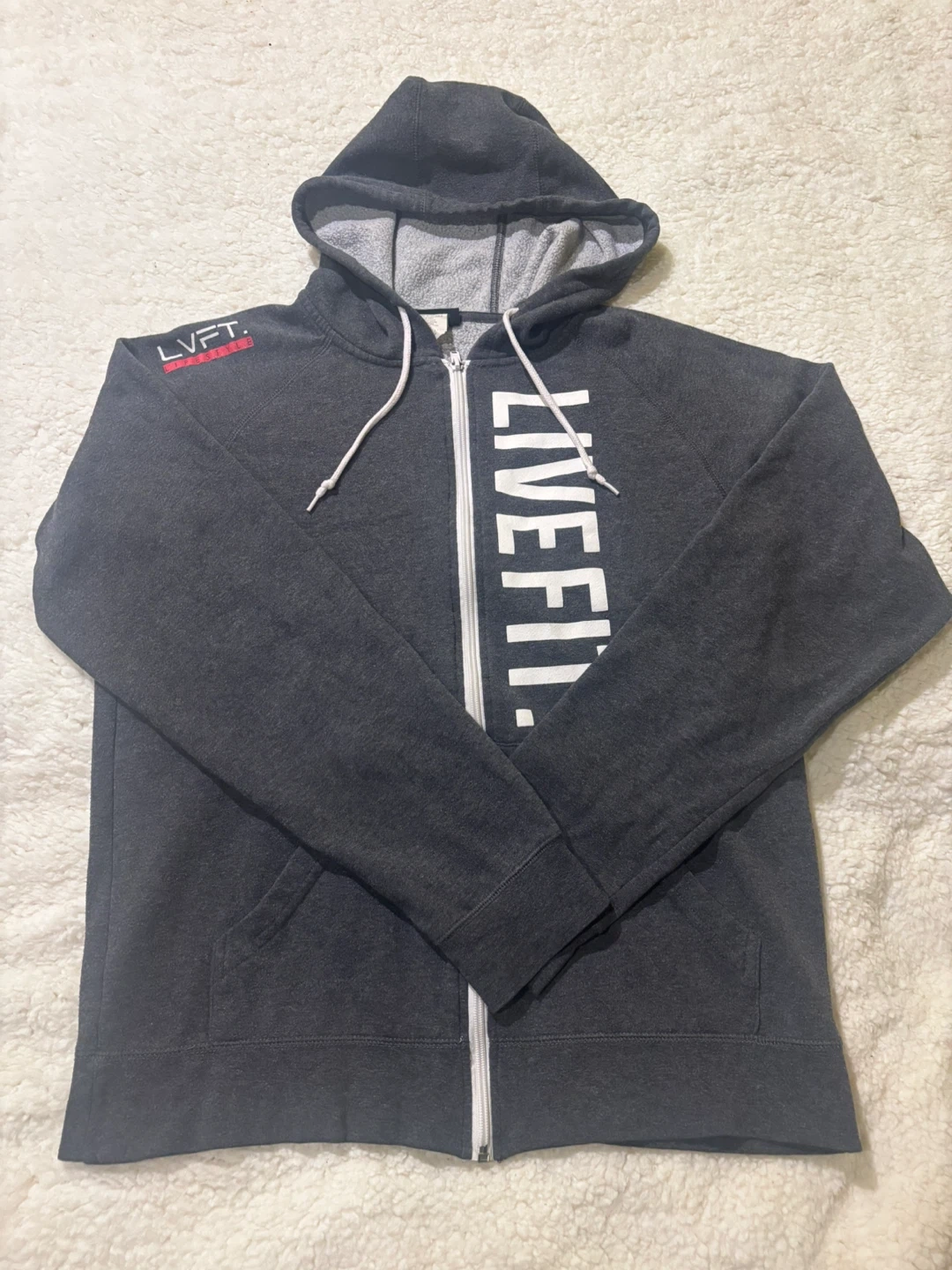 This is a dark gray zip-up hoodie from LVFT. Lifestyle. It's made of a soft cotton blend. Features a white "LIVE FIT" graphic on the front.