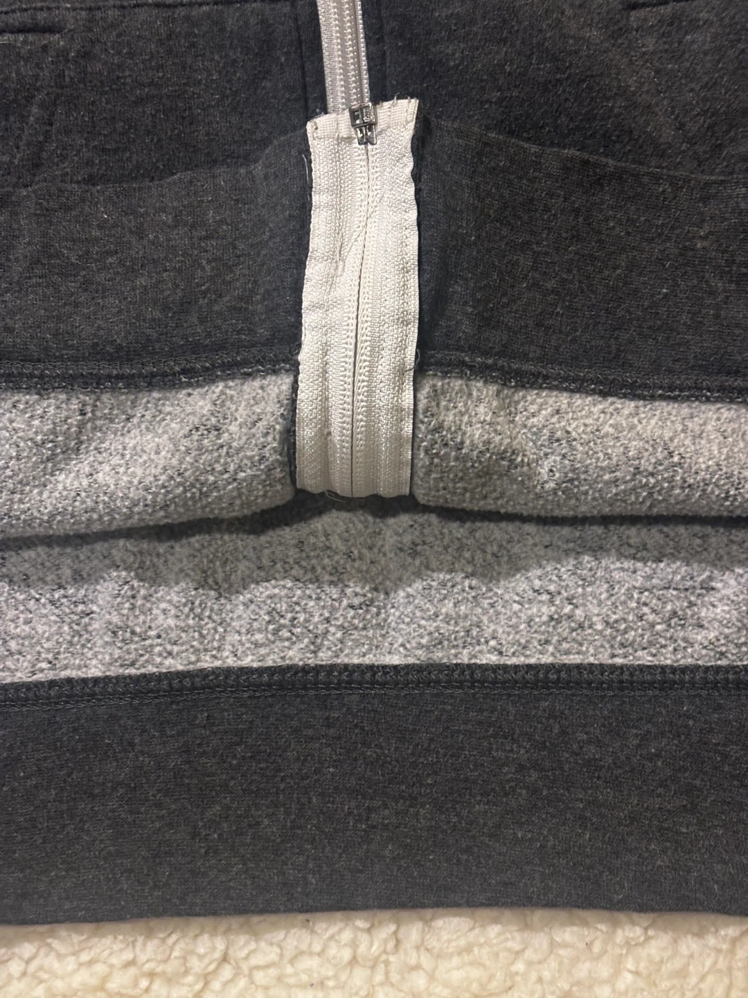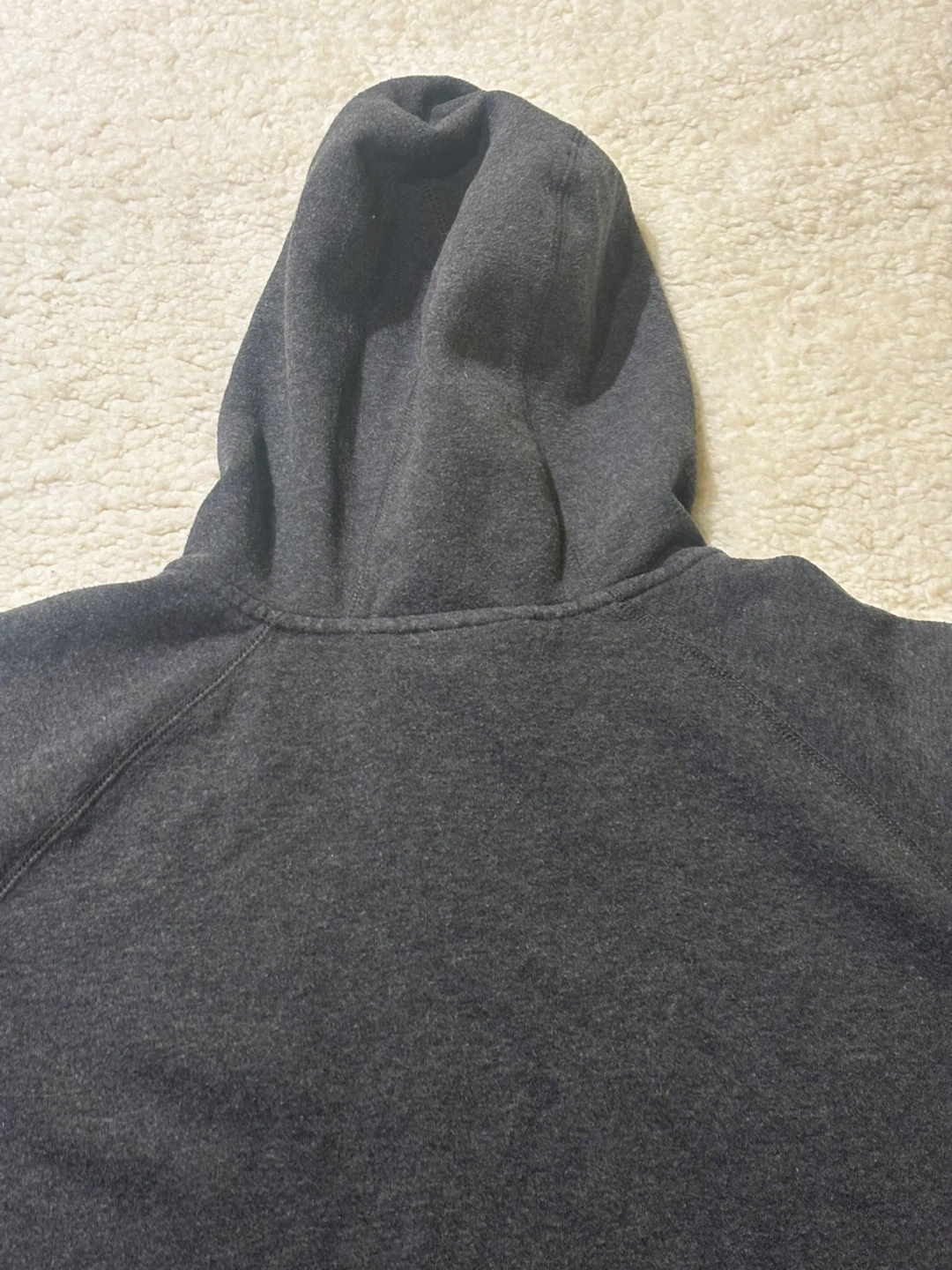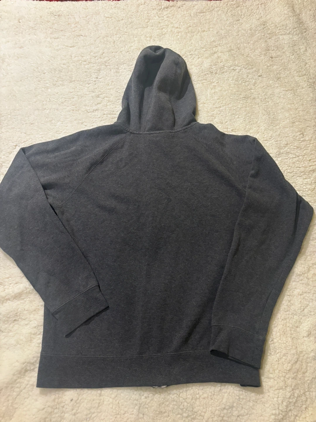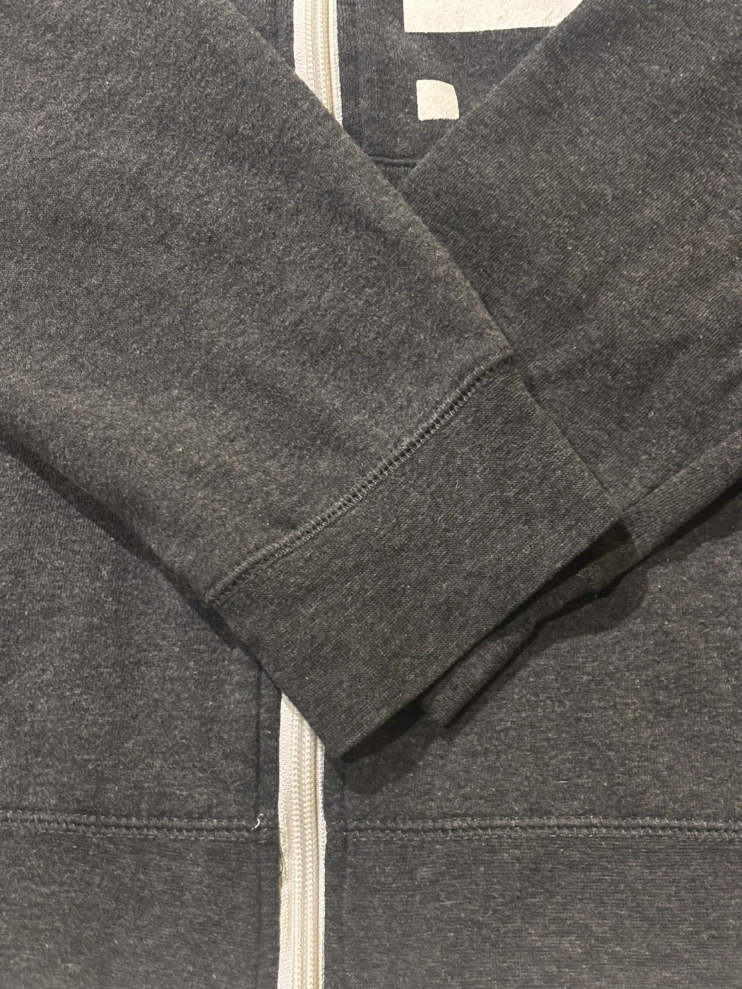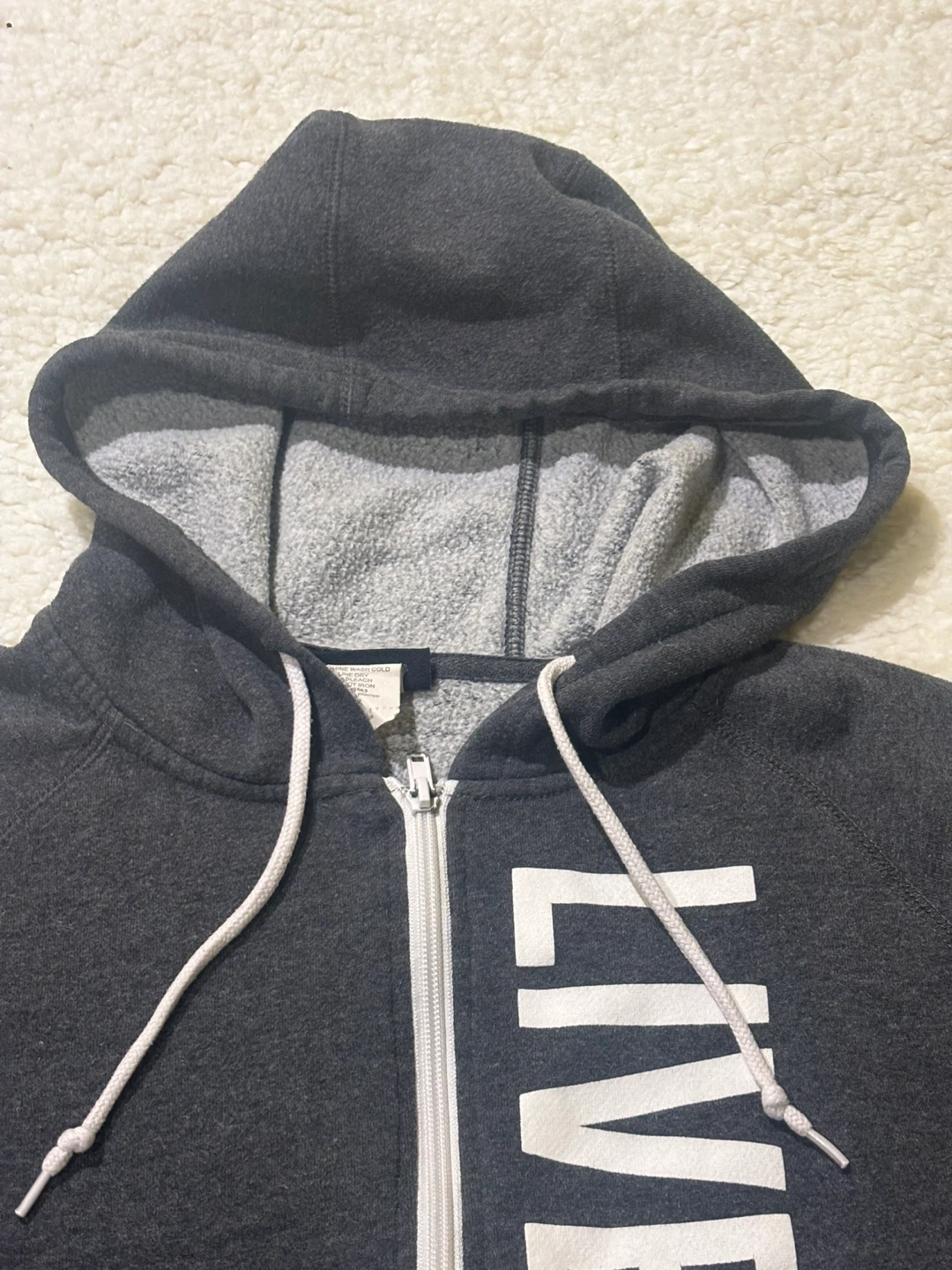This is a dark gray zip-up hoodie from LVFT. Lifestyle. It's made of a soft cotton blend. Features a white "LIVE FIT" graphic on the front.