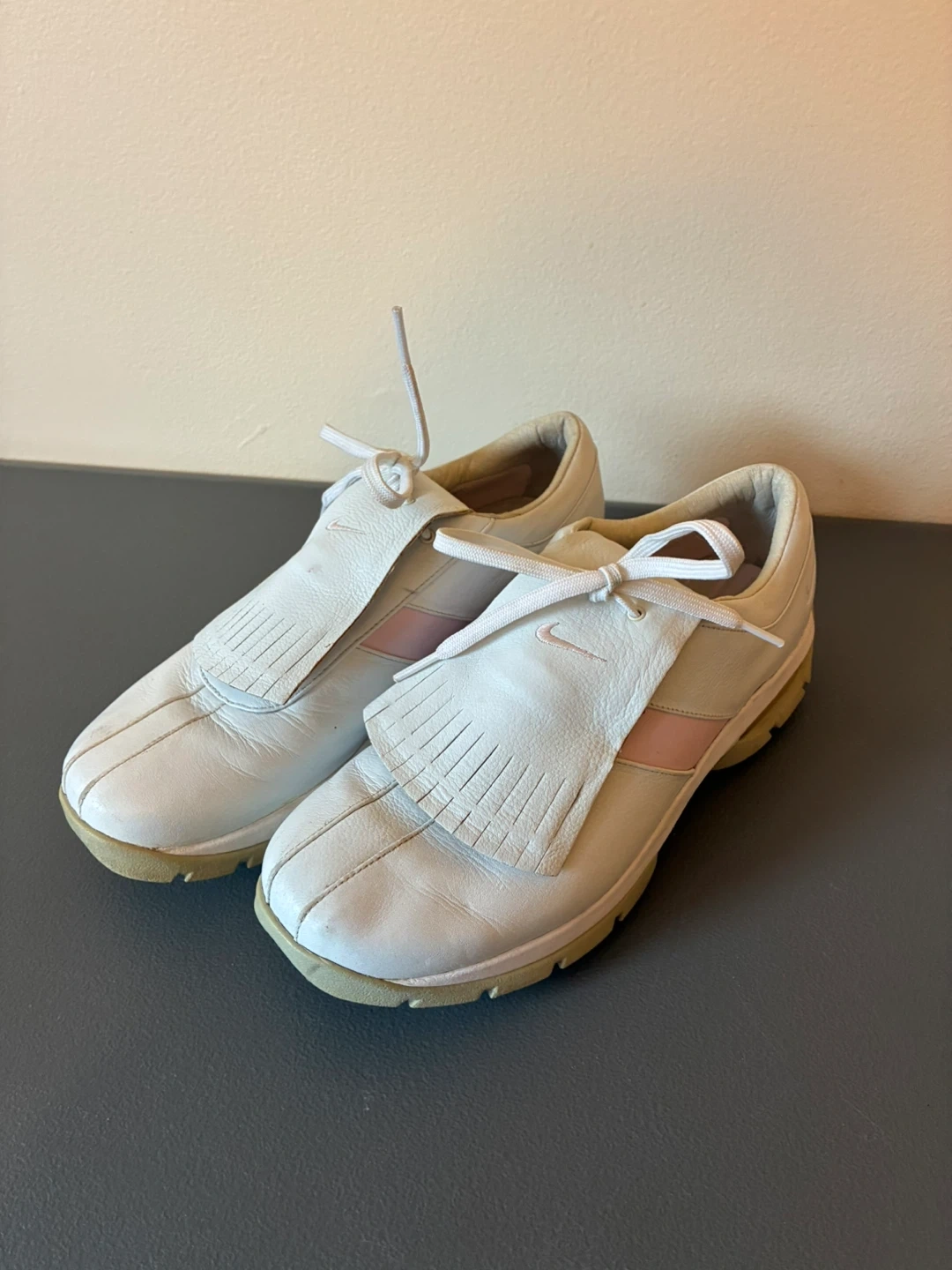 These are Nike women's golf shoes made from white leather. They feature a classic fringe detail on the vamp and subtle pink accents. The soles have spikes for traction on the course. A great choice for any golfer!