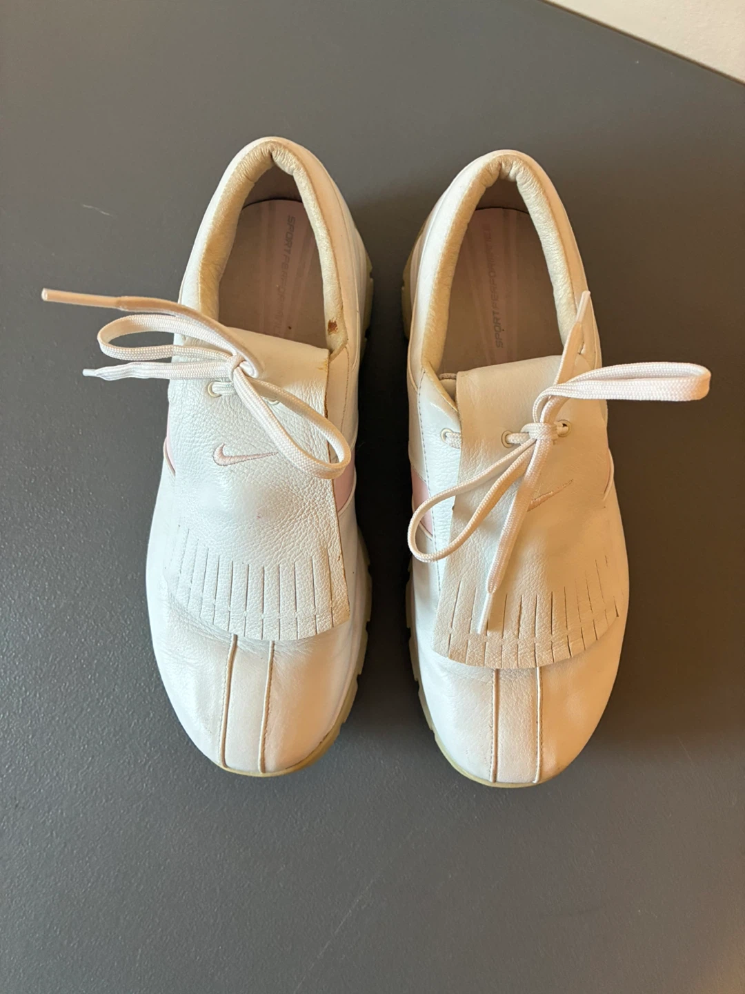 These are Nike women's golf shoes made from white leather. They feature a classic fringe detail on the vamp and subtle pink accents. The soles have spikes for traction on the course. A great choice for any golfer!