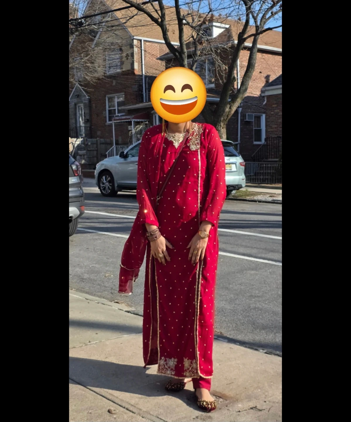 Beautiful red Indian outfit with gold dot embellishments and trim. Features wide sleeves and intricate border work. It's a striking and festive piece! Only used ones