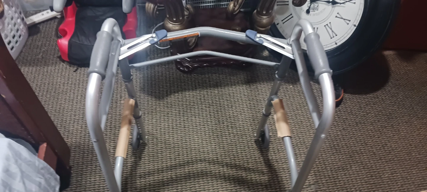 This is an aluminum folding walker. It's lightweight and easy to fold for storage. The adjustable height makes it a versatile mobility aid. It has two wheels in the front for smooth gliding.
