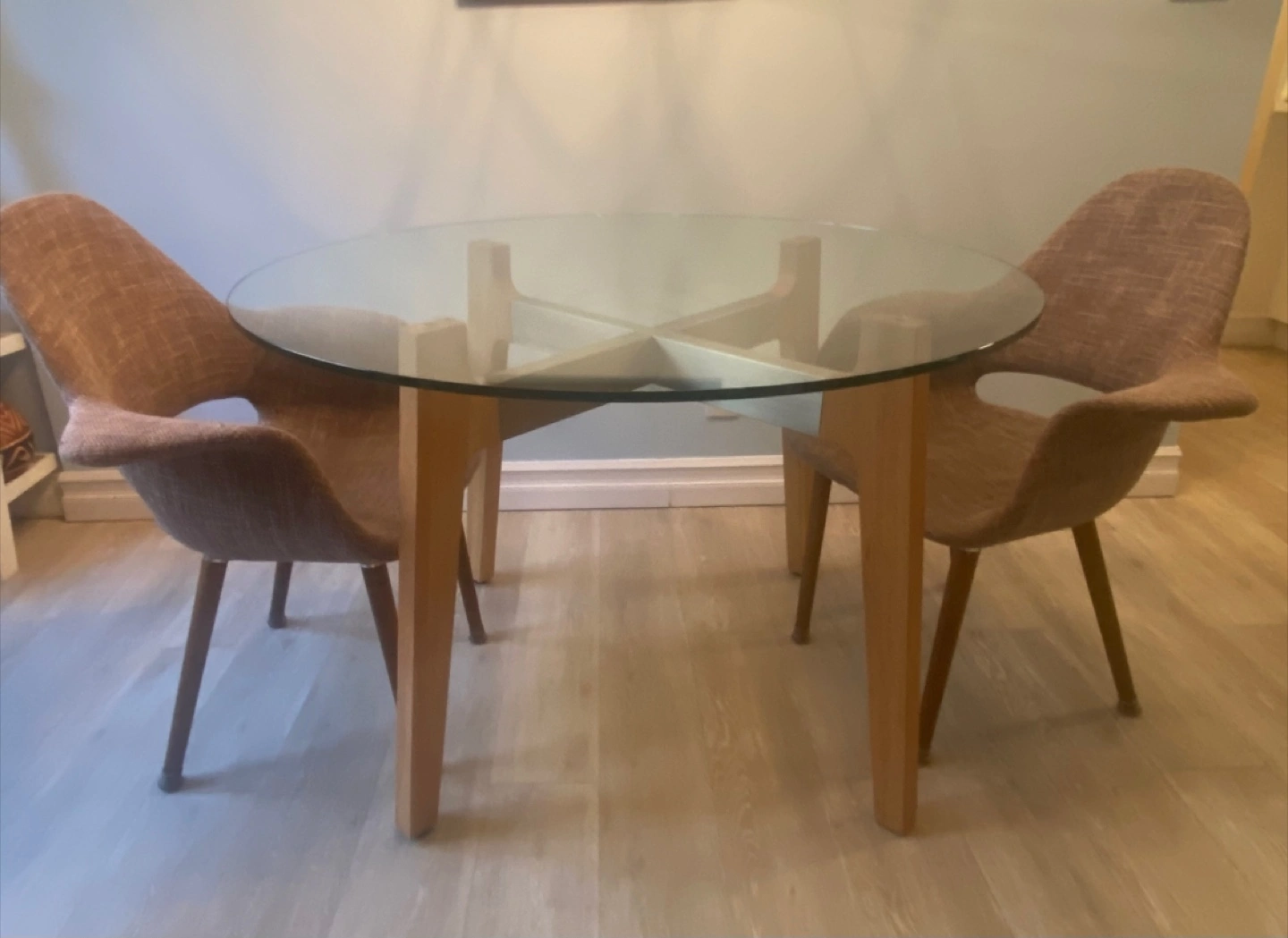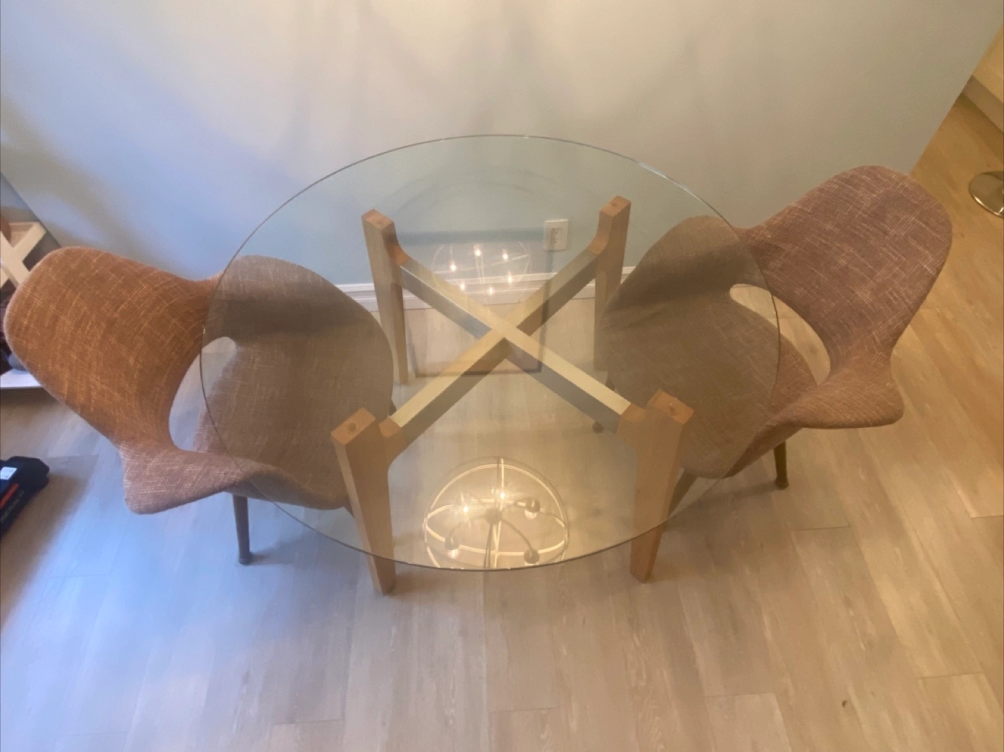 Selling a stylish round dining table with a glass top, perfect for a small dining area or kitchen! It comes with two matching chairs that are comfortable and have a unique design. The set is in great condition and ready to add a touch of modern elegance to your home. 47” round 30” high.