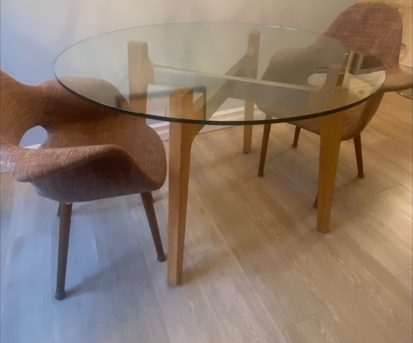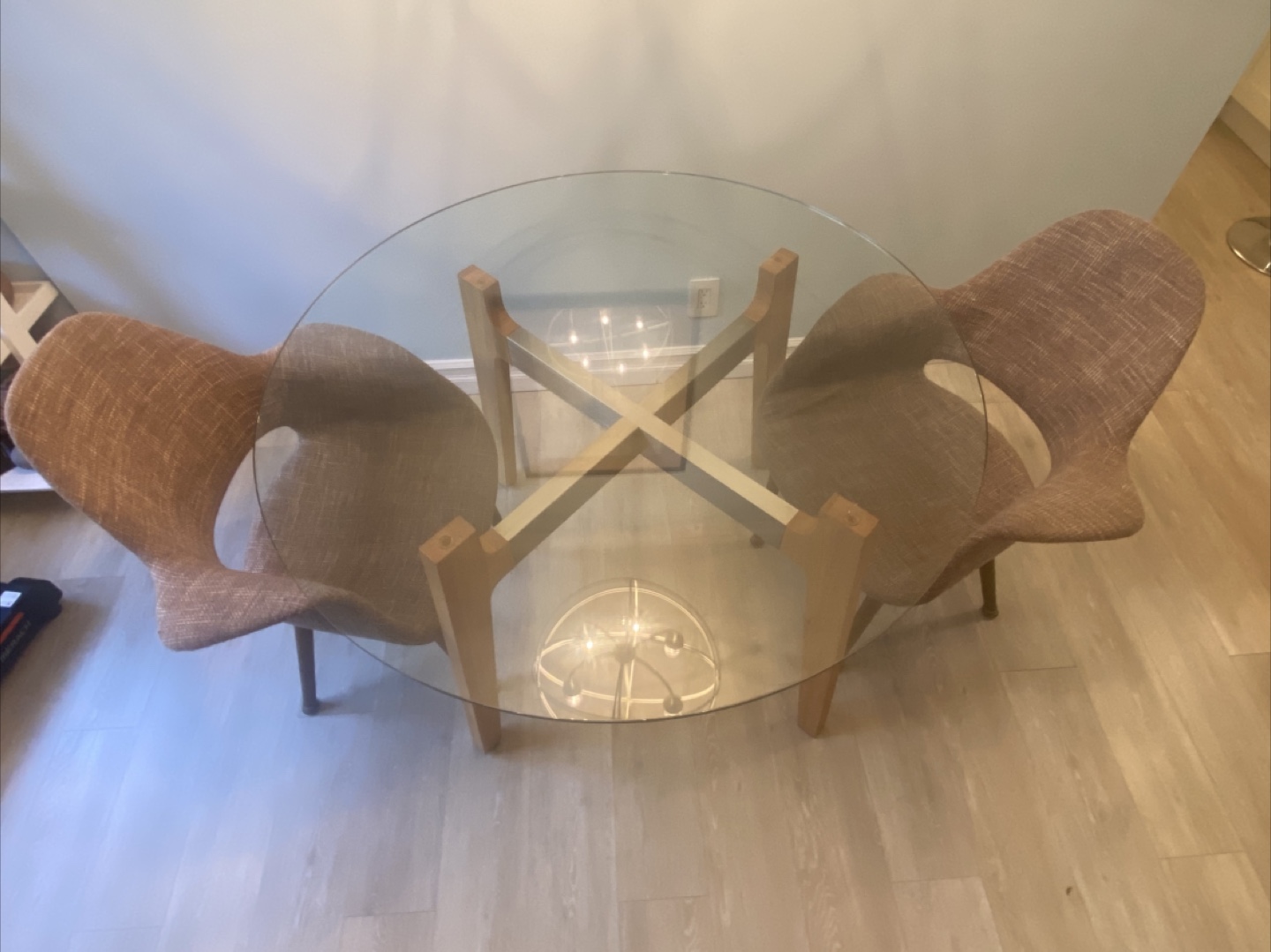 Selling a stylish round dining table with a glass top, perfect for a small dining area or kitchen! It comes with two matching chairs that are comfortable and have a unique design. The set is in great condition and ready to add a touch of modern elegance to your home. 47” round 30” high.