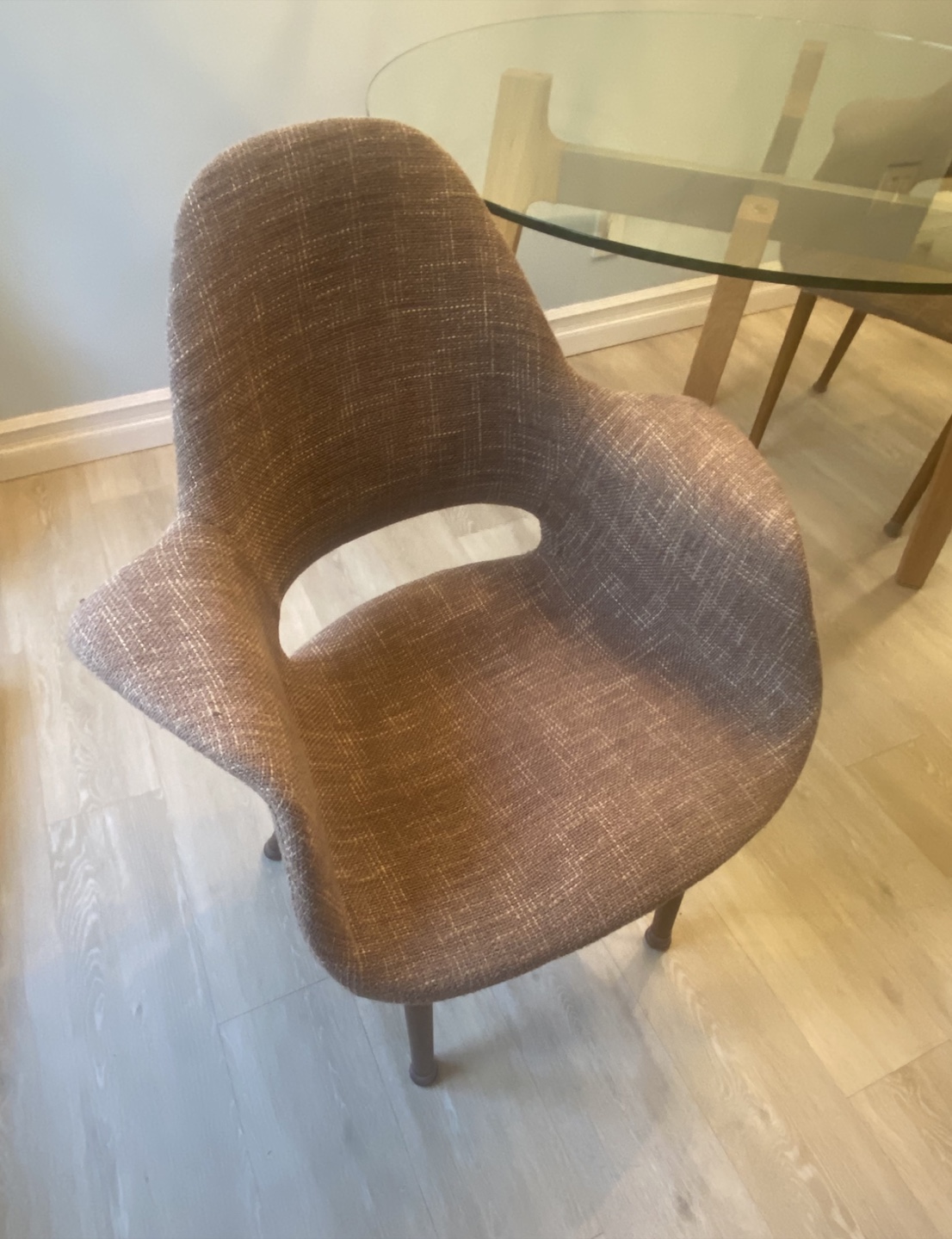 Chairs are tweed. Super clean. Reinforced and can hold a heavy weight. Legs screw off for easy move.