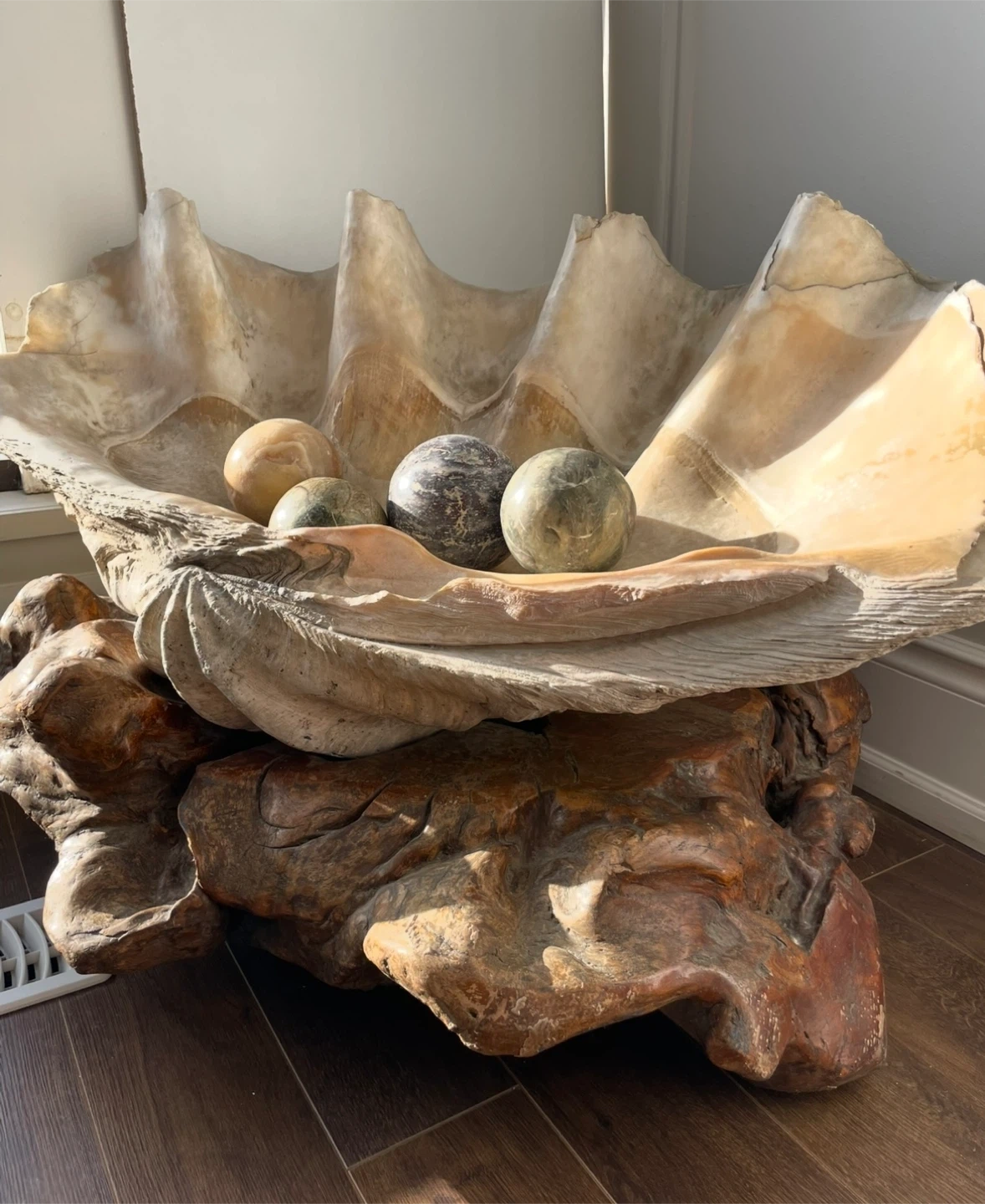 Selling a decorative Giant clam shell with a set of stone balls. The shell measures approximately 34 1/2 inches in length and 24 inches in height. It makes a unique statement piece for any room.