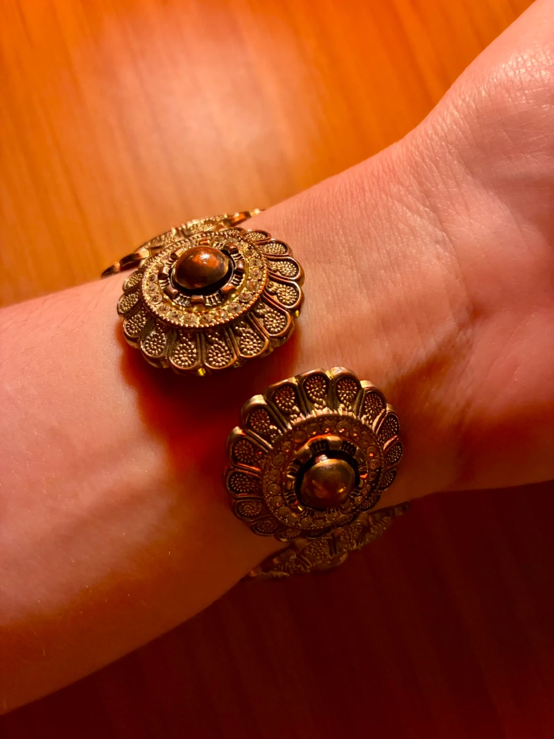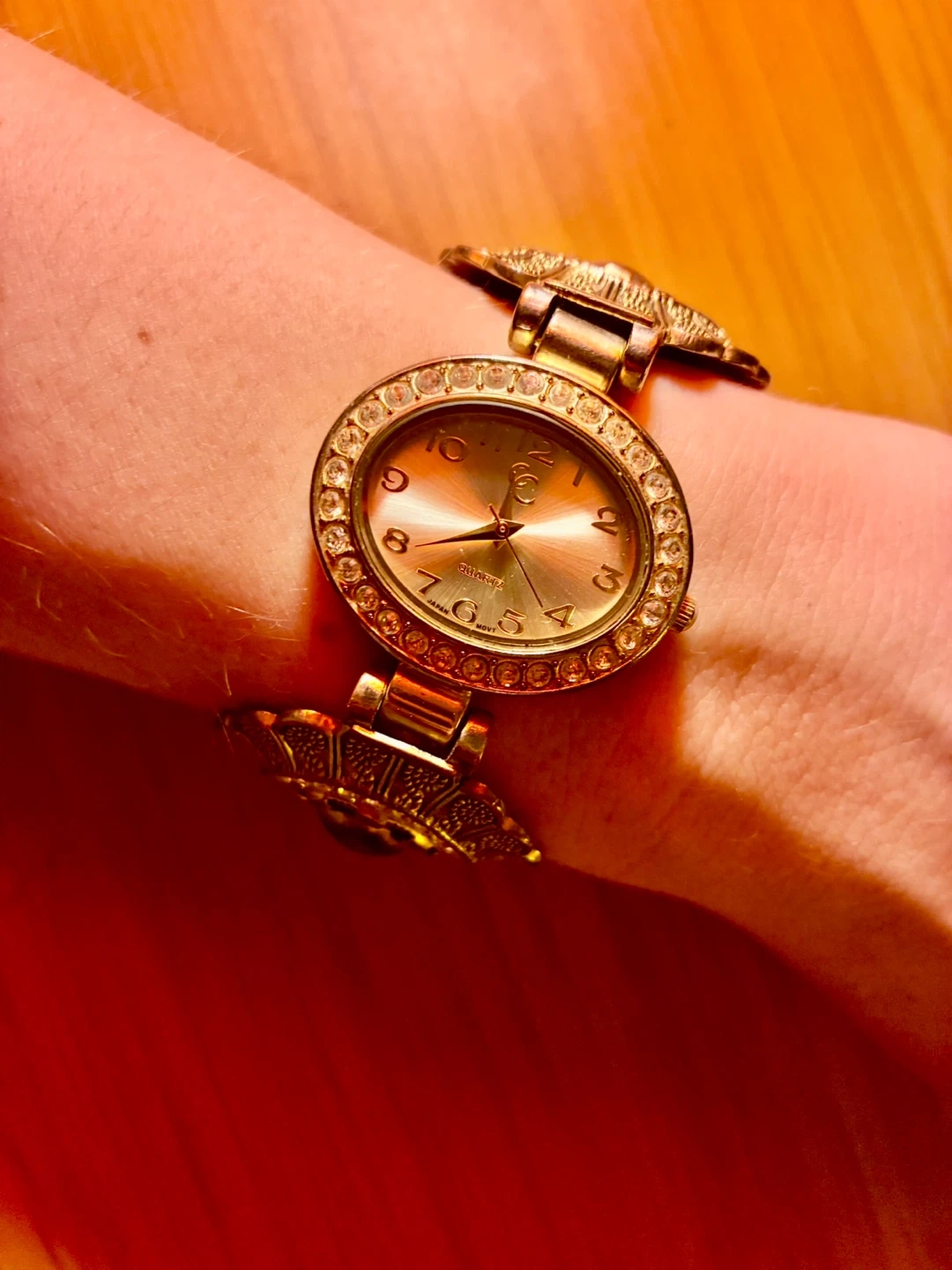 Elegant gold tone bangle watch with an oval face. Features a sparkling rhinestone-embellished bezel and decorative floral accents on the band. A beautiful accessory for any occasion!