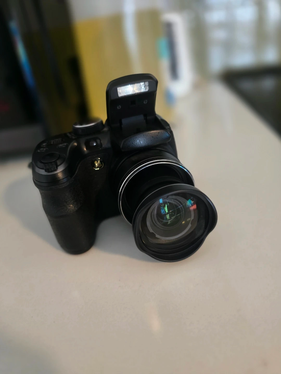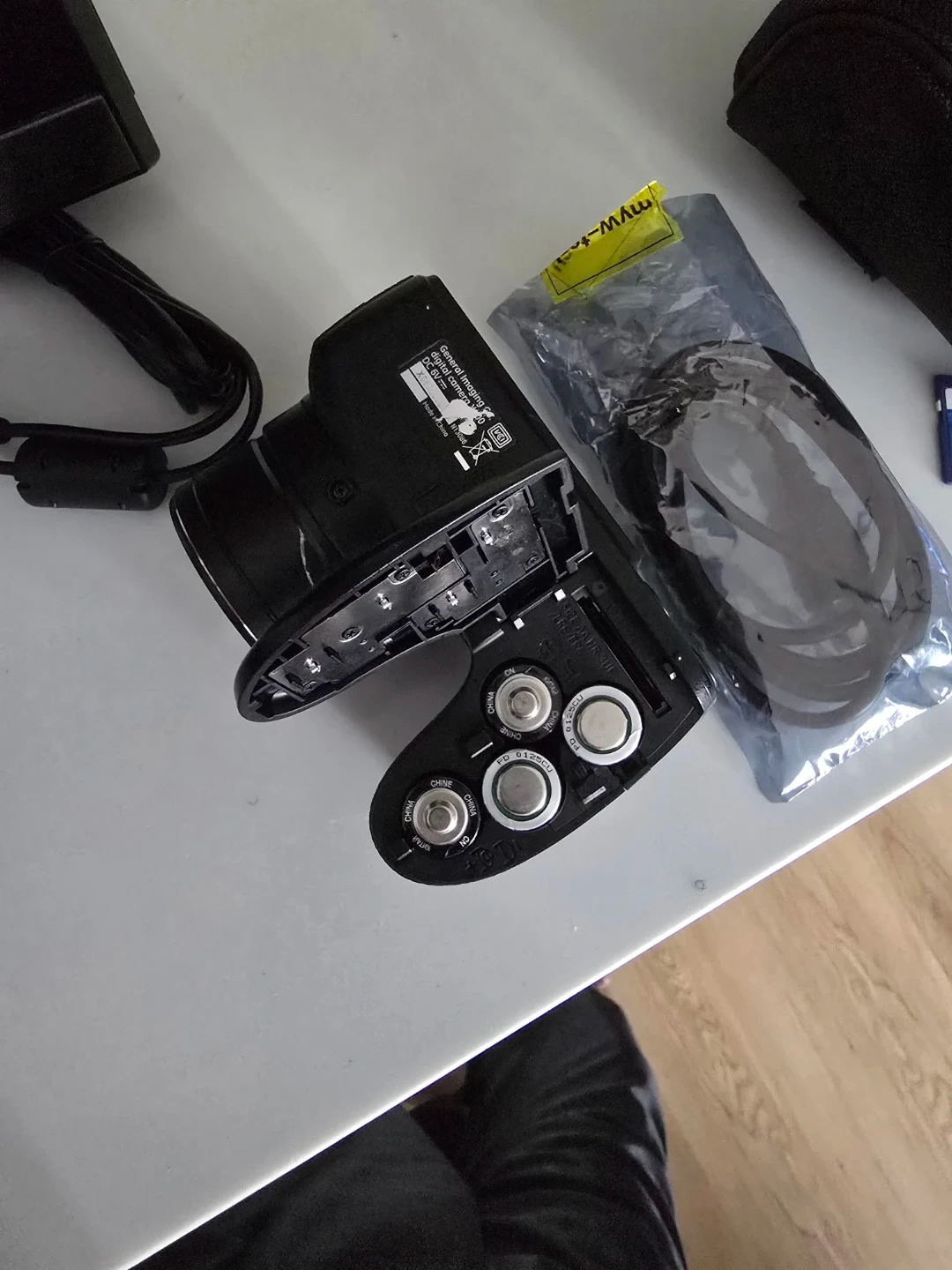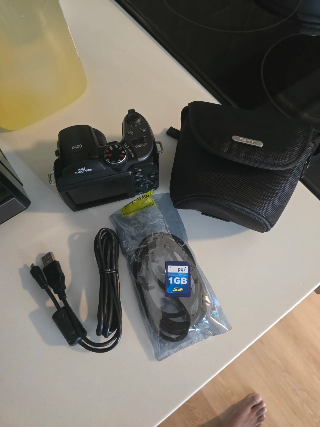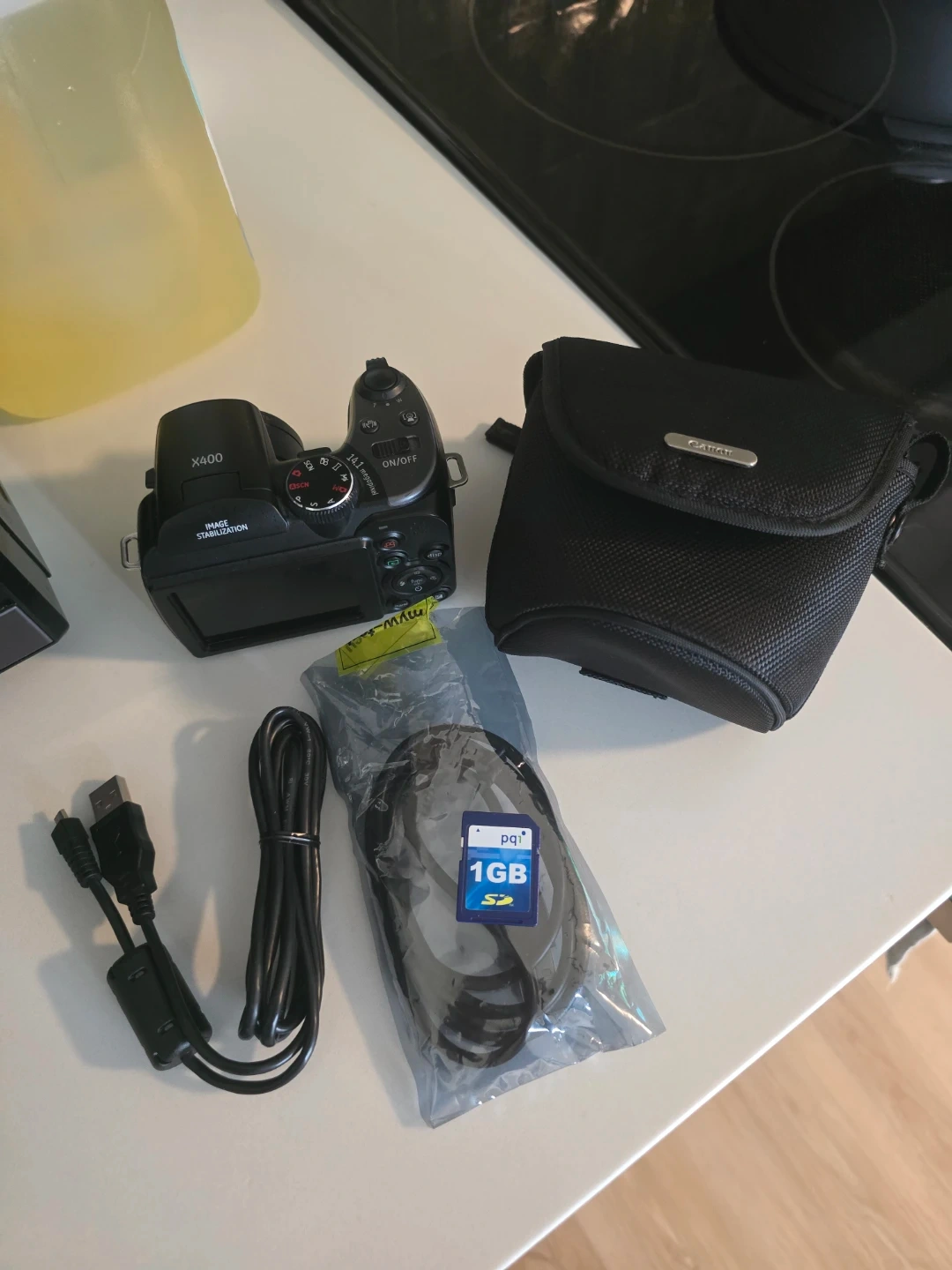 This is a black digital camera with 14.1 megapixels and 15x optical zoom. It includes a carrying case, an a second camera everything go together as a bundle.USB cable, AV cable, and a 1GB SD card. Image stabilization is built-in for clearer shots.( Pick up only cash or zell )