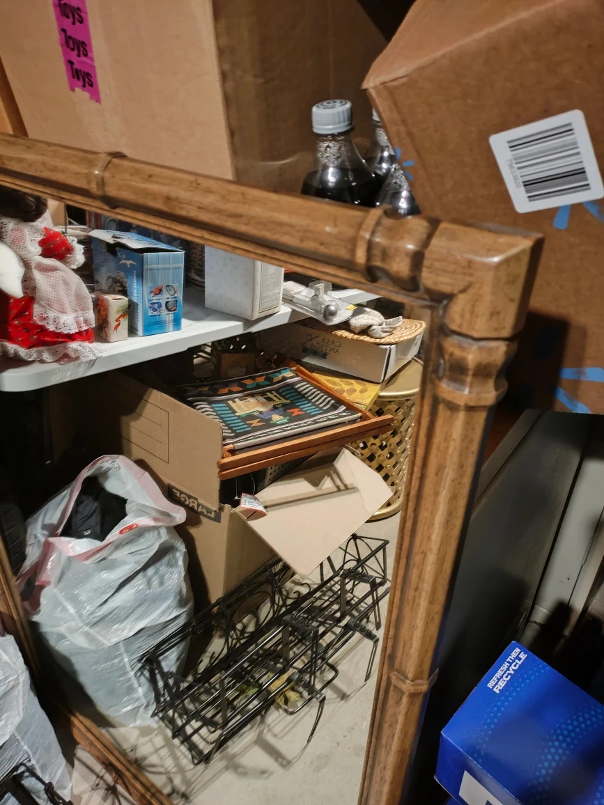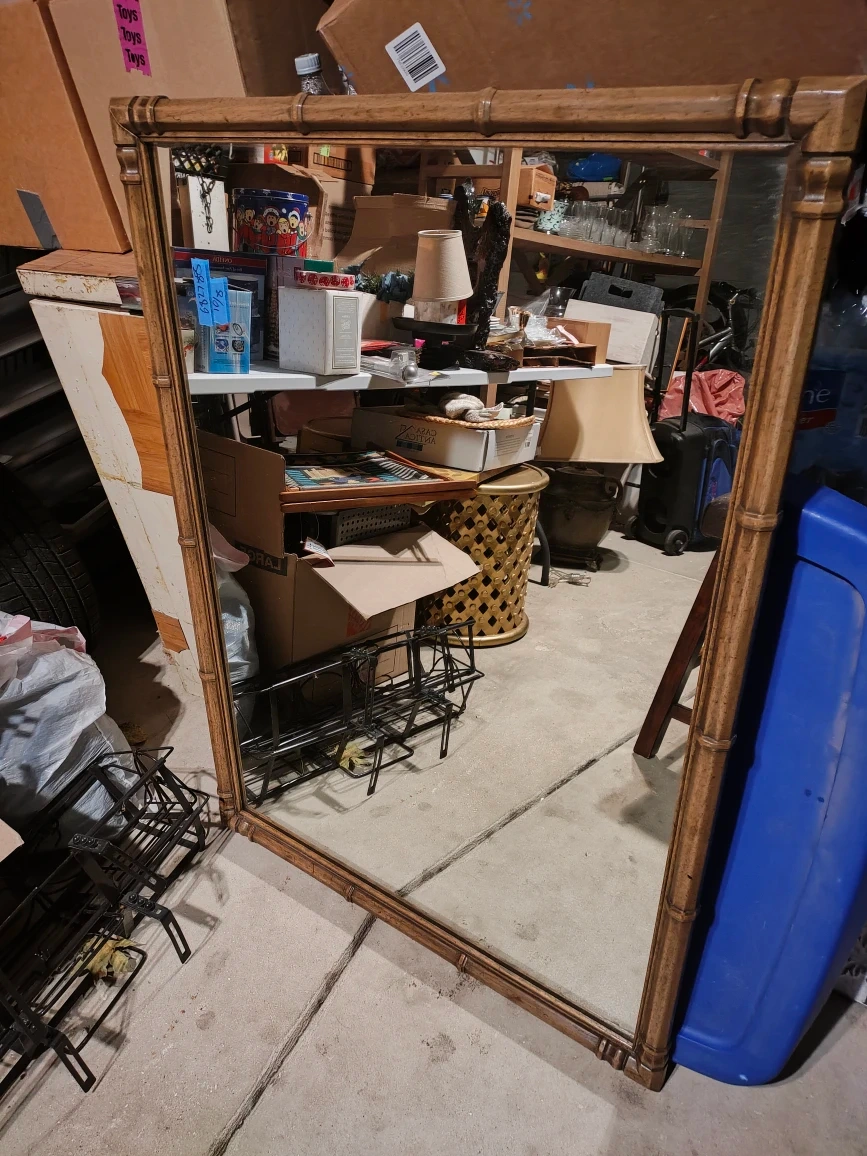 Selling a framed mirror with a bamboo-style frame. It's in good condition and ready to brighten up your space!