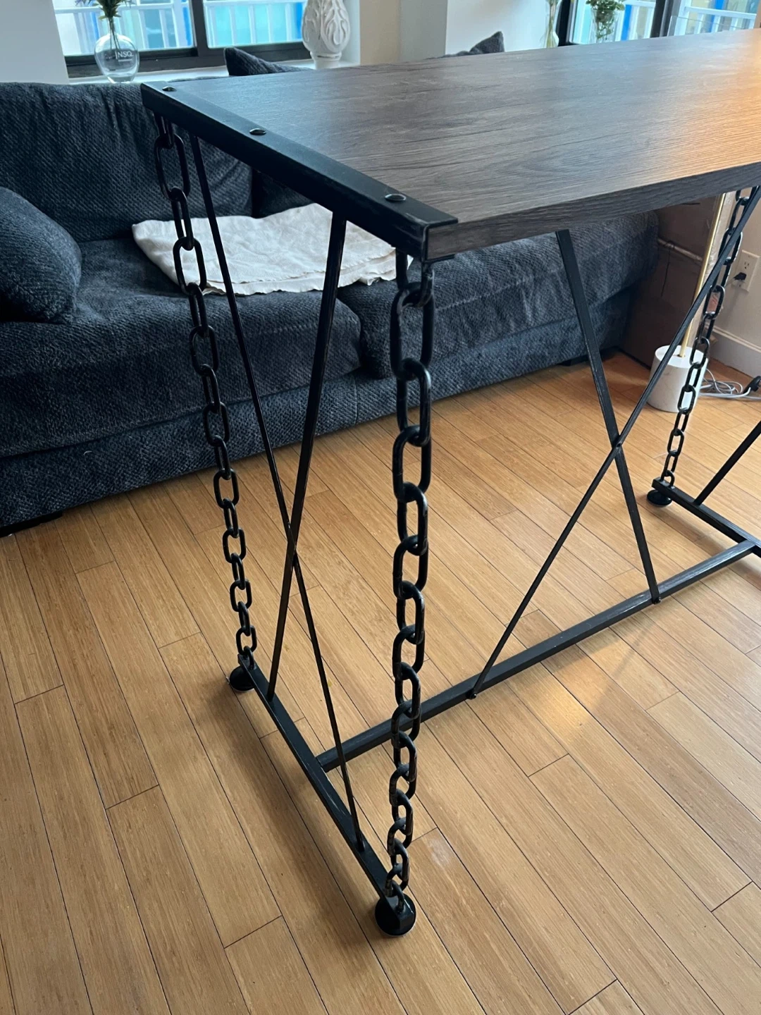 A unique industrial-style bar table featuring a solid wood top and a black metal frame with decorative chain accents. Great as a statement piece for a home interior, bar area, or coffee shop.