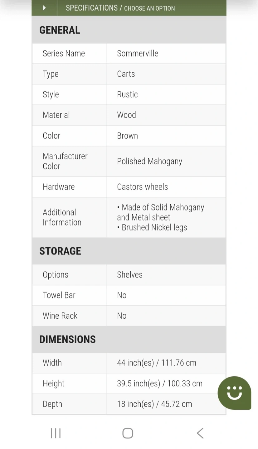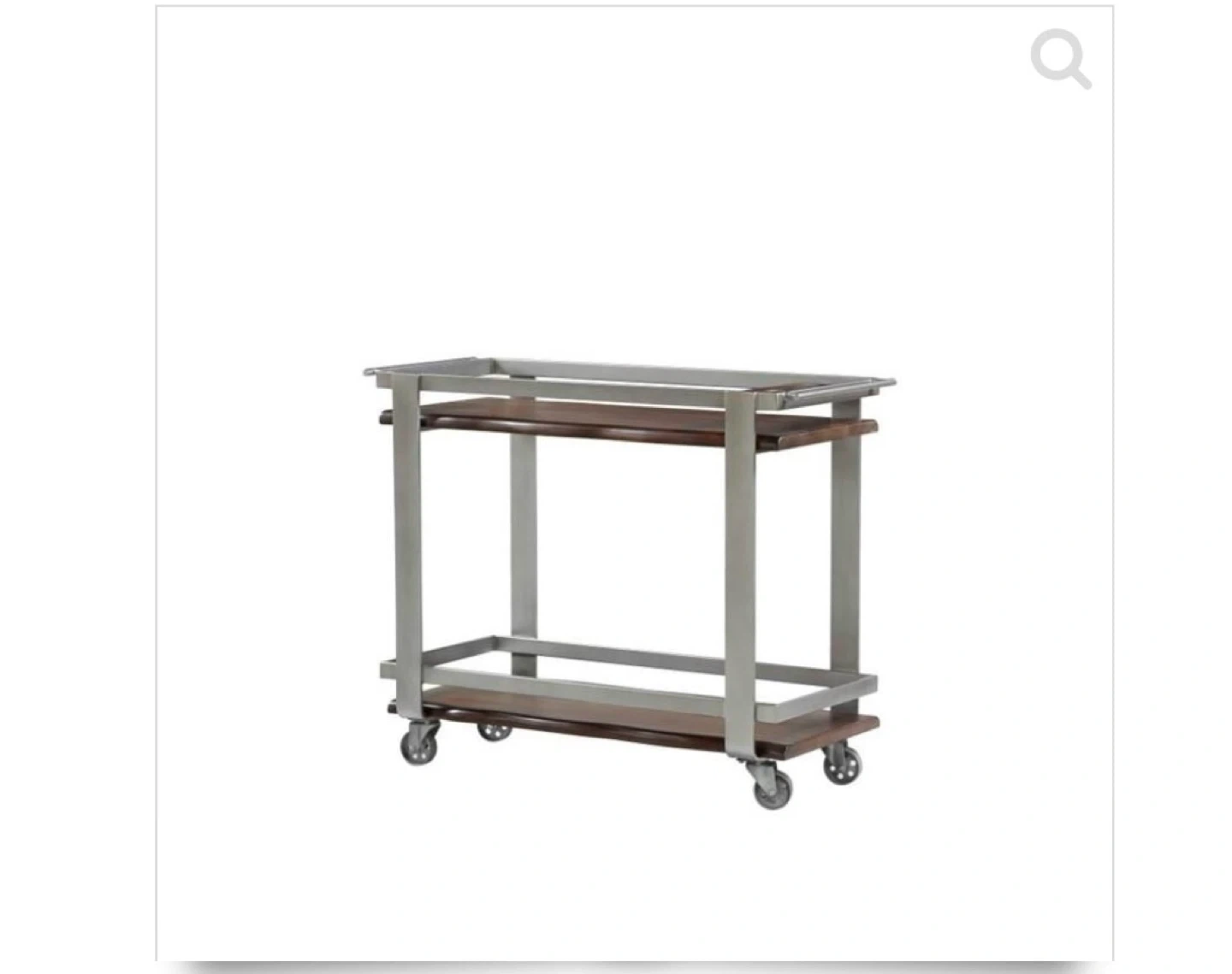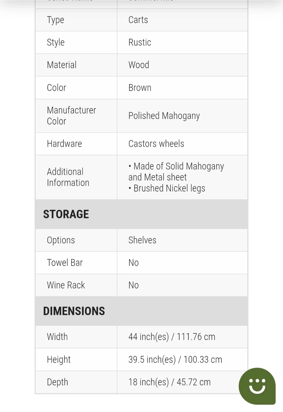 This rustic bar cart is made of solid mahogany and metal. It features shelves and castor wheels. Dimensions are 44 inches wide, 39.5 inches high, and 18 inches deep.