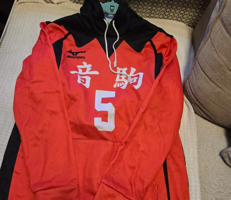 This is a red and black Mizuno hoodie inspired by the "Haikyuu!!" anime, featuring the "Karasuno High" team design and the number 5. (Manga NOT included!)