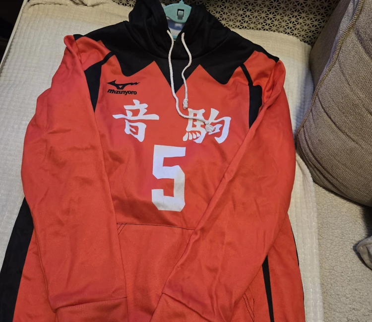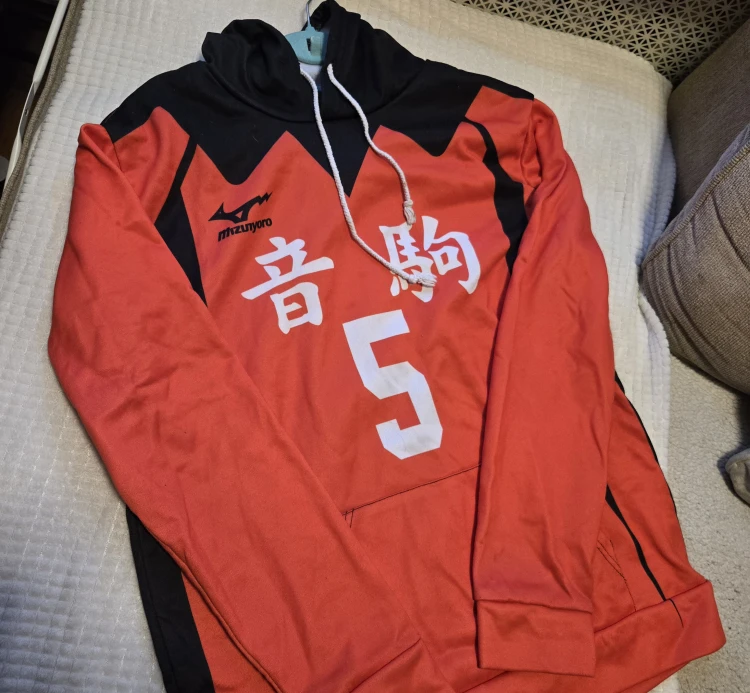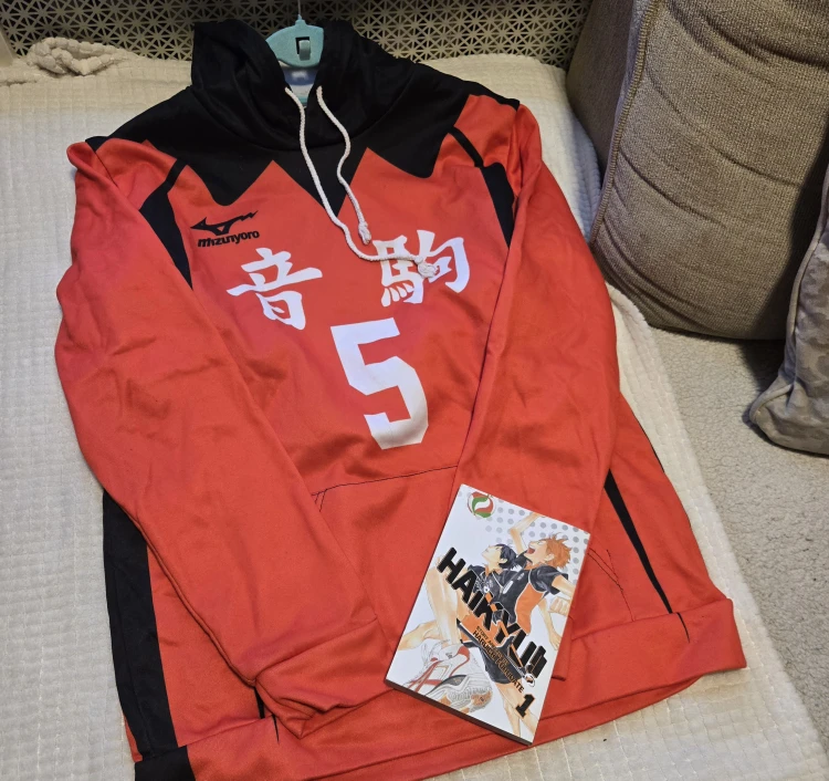This is a red and black Mizuno hoodie inspired by the "Haikyuu!!" anime, featuring the "Karasuno High" team design and the number 5. (Manga NOT included!)