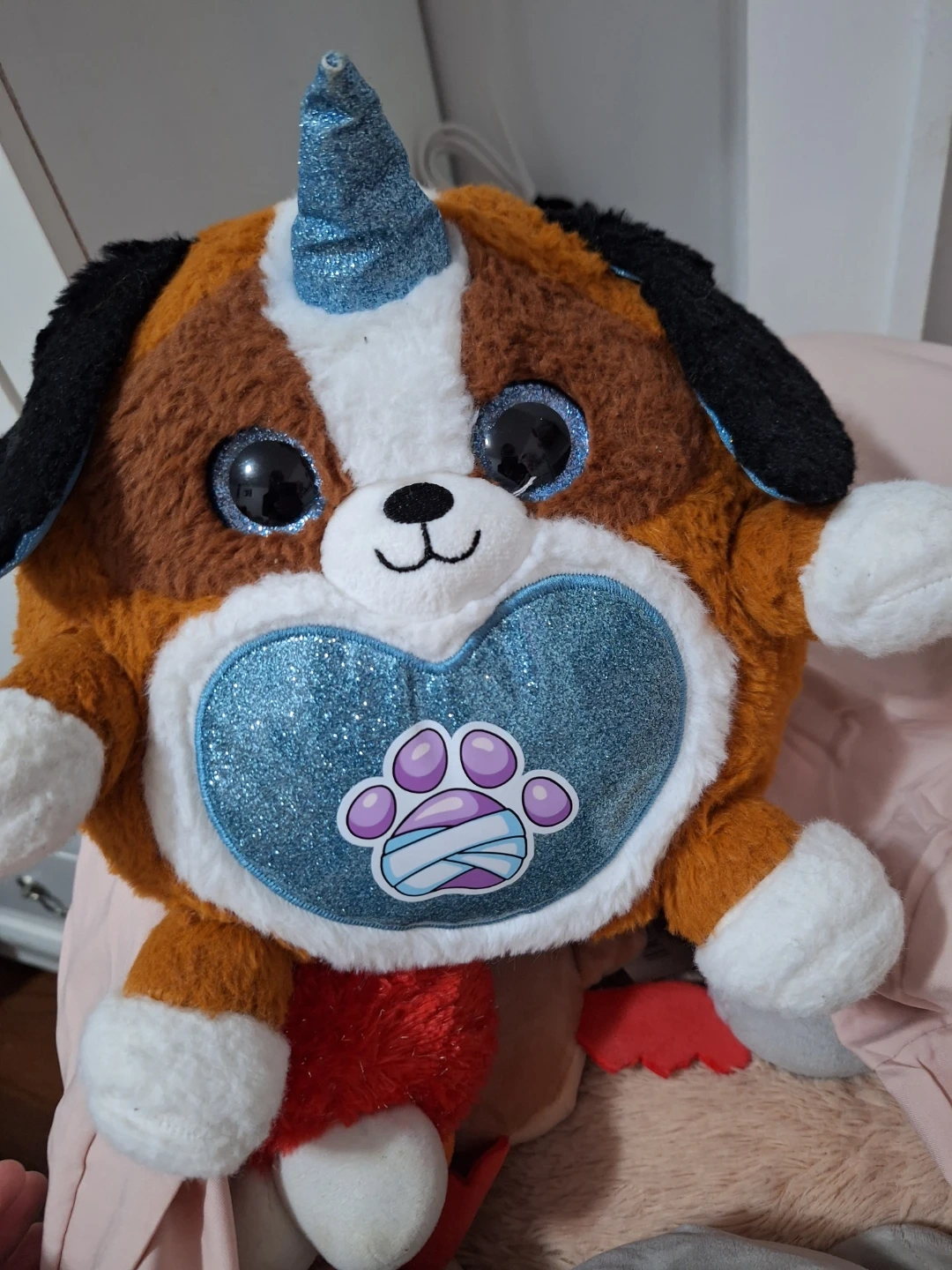 This is a plush dog with a blue, glittery unicorn horn. It has big, sparkly blue eyes and a blue glitter heart on its chest with a paw print sticker. The plush is brown, white, and black.