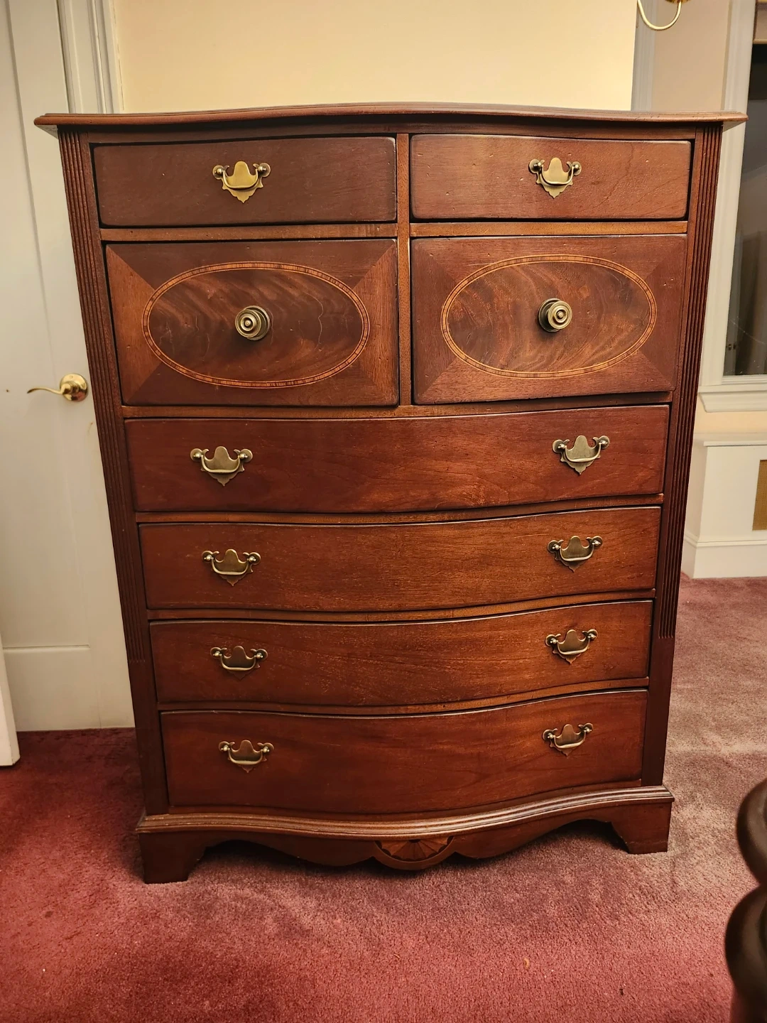 This is a LEXIGNTON beautiful chest of drawers made from rich cherry wood. It features six drawers with ornate brass pulls, perfect for storing clothes or linens. The wood has a lovely sheen and the oval inlays on the two large drawers add a touch of elegance. Its classic design makes it a great addition to any bedroom!