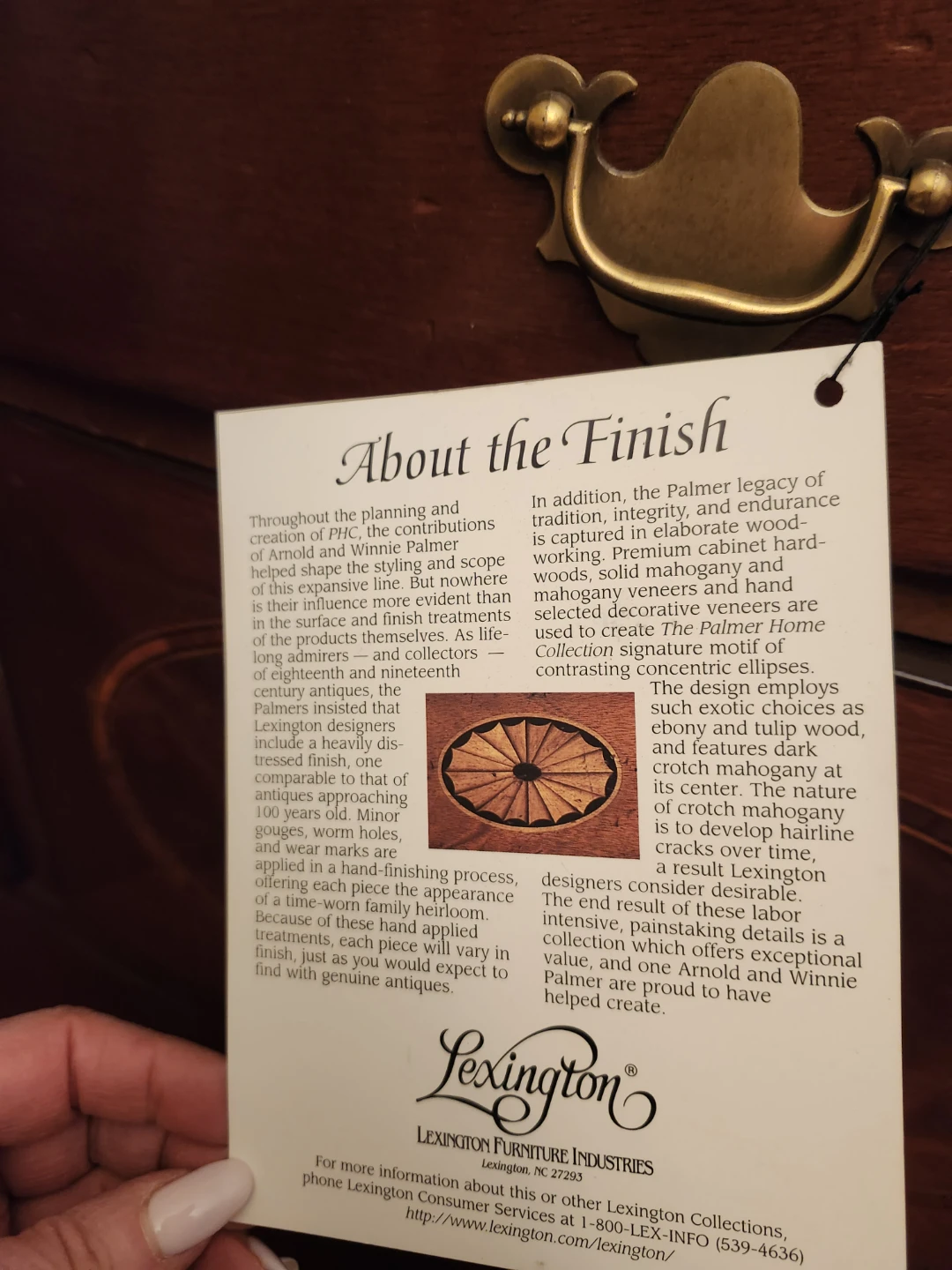 This is a LEXIGNTON beautiful chest of drawers made from rich cherry wood. It features six drawers with ornate brass pulls, perfect for storing clothes or linens. The wood has a lovely sheen and the oval inlays on the two large drawers add a touch of elegance. Its classic design makes it a great addition to any bedroom!