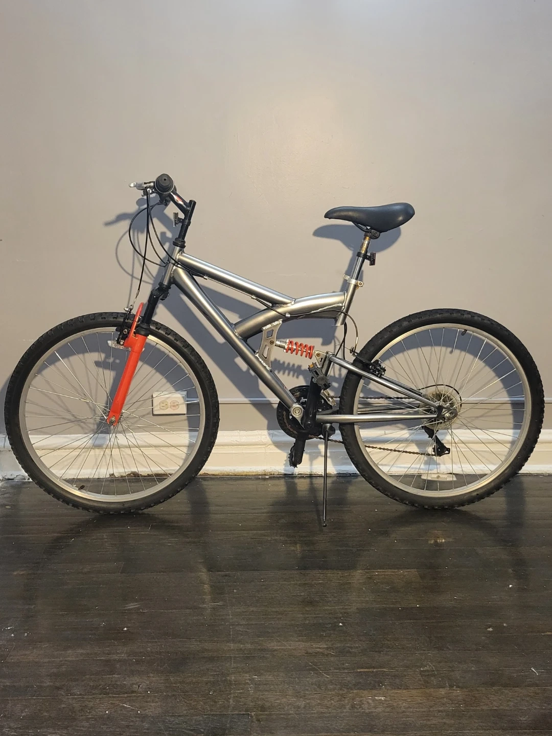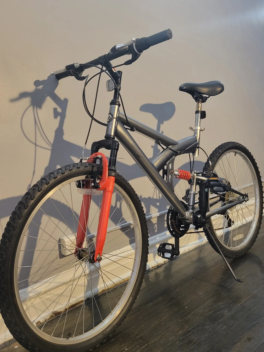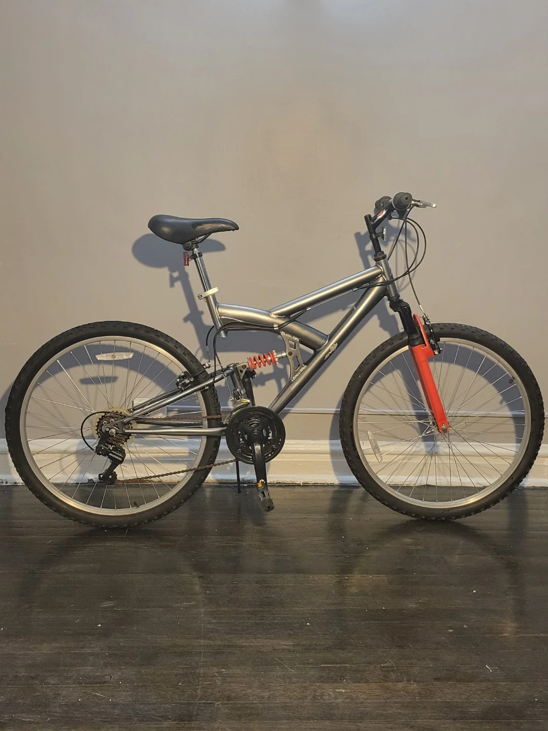 This is a full suspension mountain bike with a gray frame. It has red accents on the front fork. The tires appear to be standard mountain bike size.