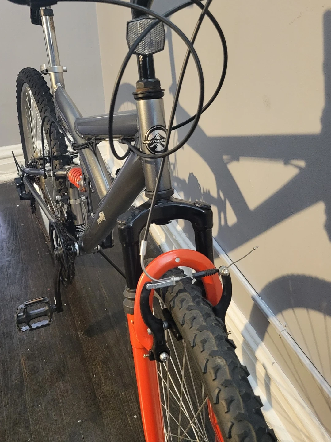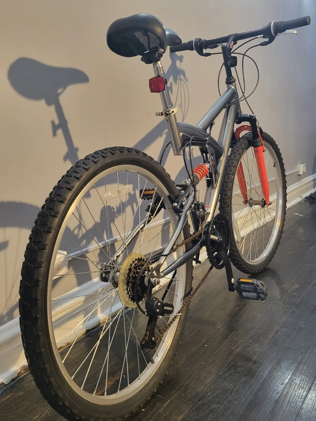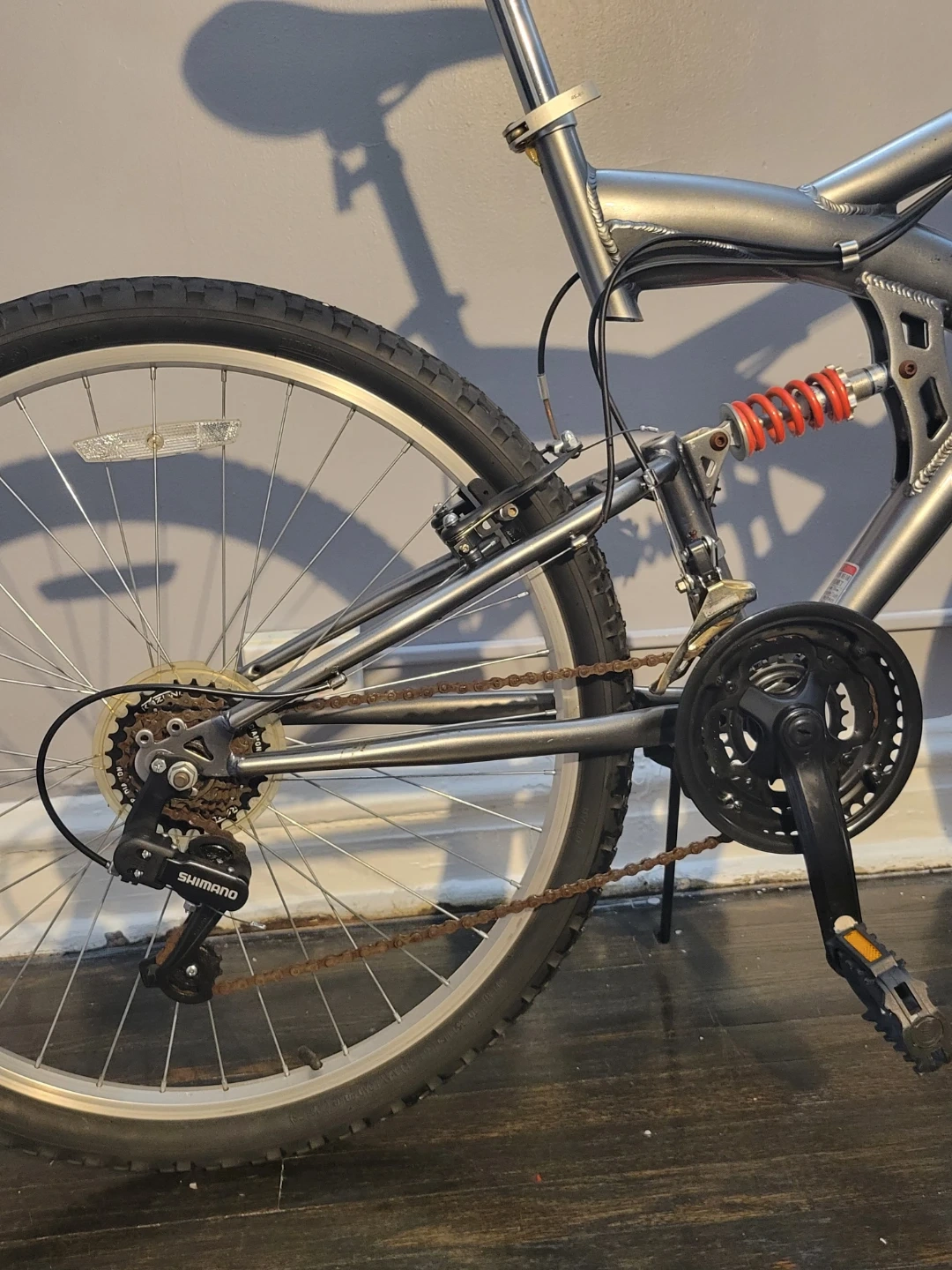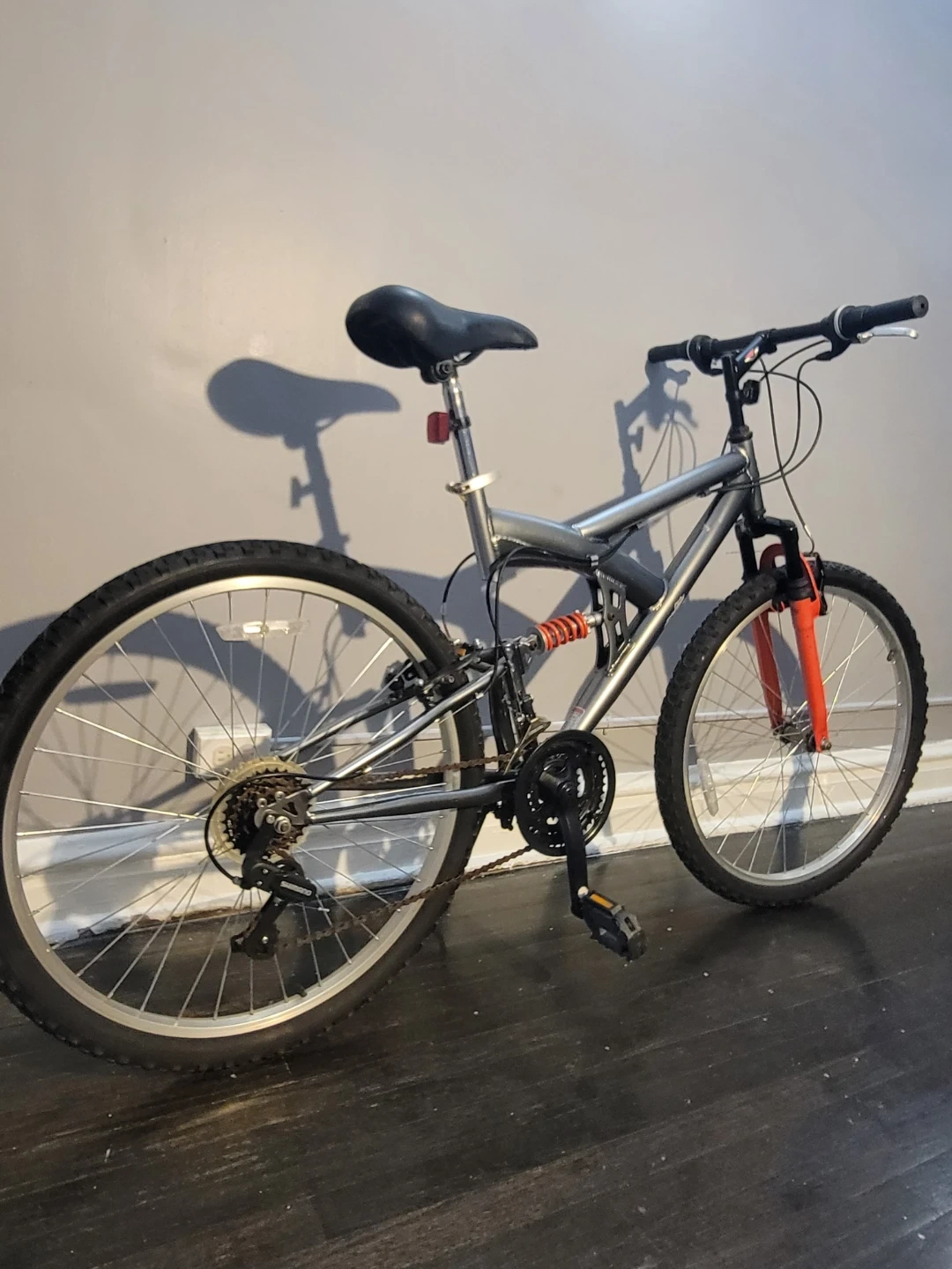 This is a full suspension mountain bike with a gray frame. It has red accents on the front fork. The tires appear to be standard mountain bike size.