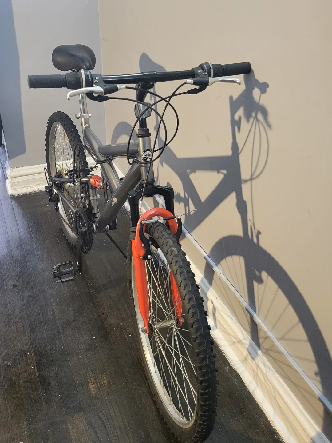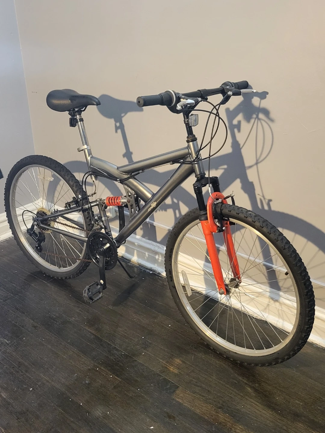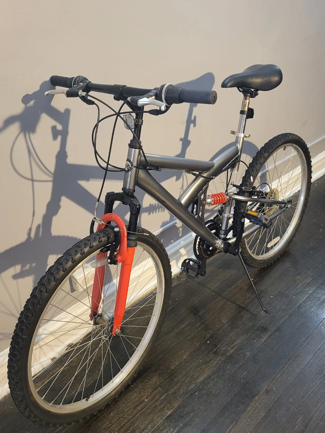 This is a full suspension mountain bike with a gray frame. It has red accents on the front fork. The tires appear to be standard mountain bike size.