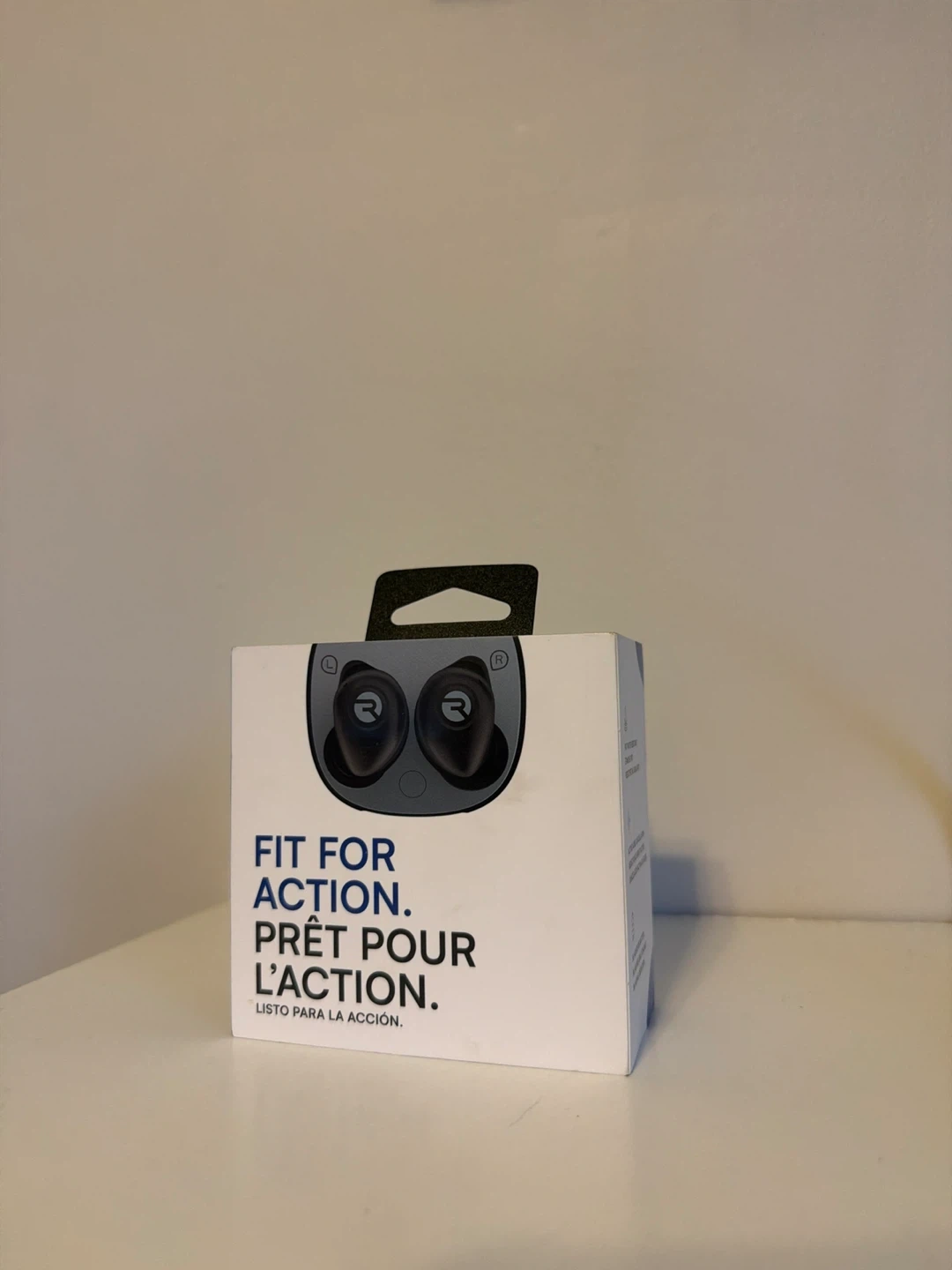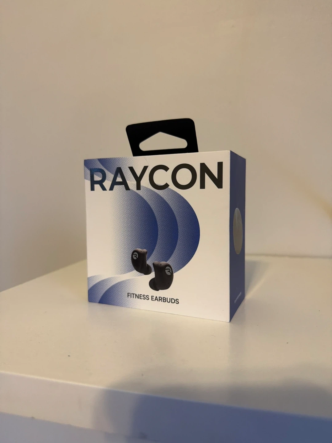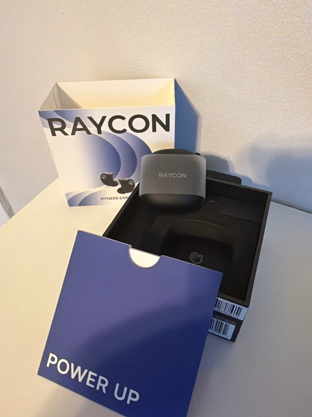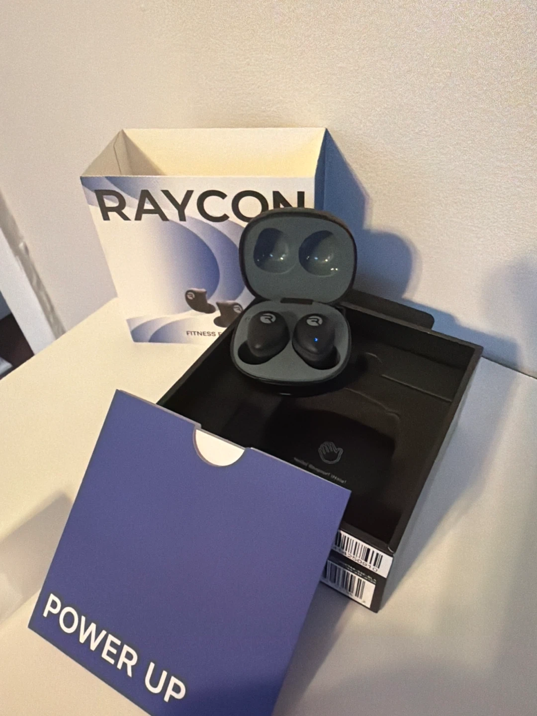 Raycon wireless fitness earbuds in black. Comes with charging case and original box. "Power Up" manual included.