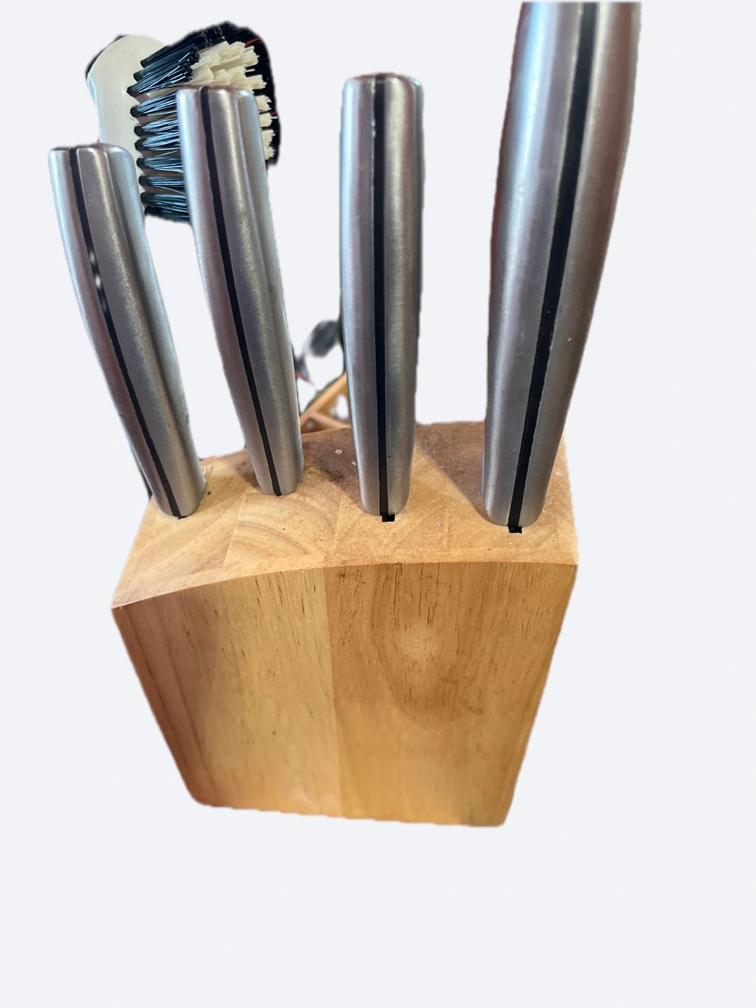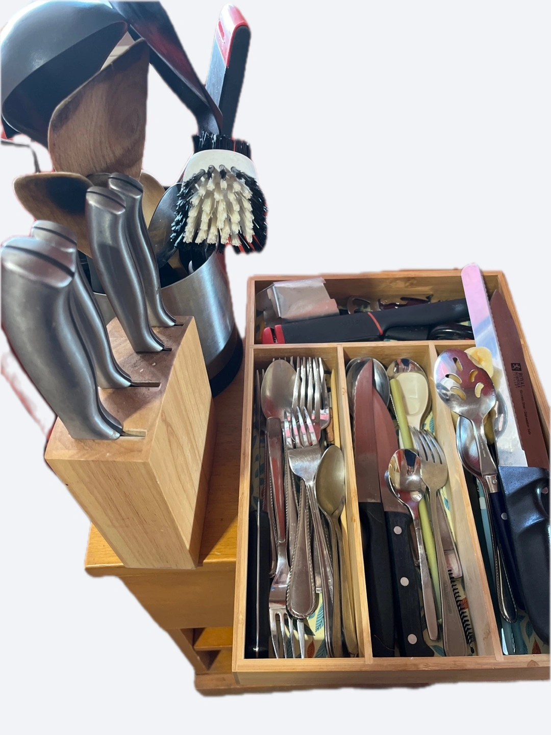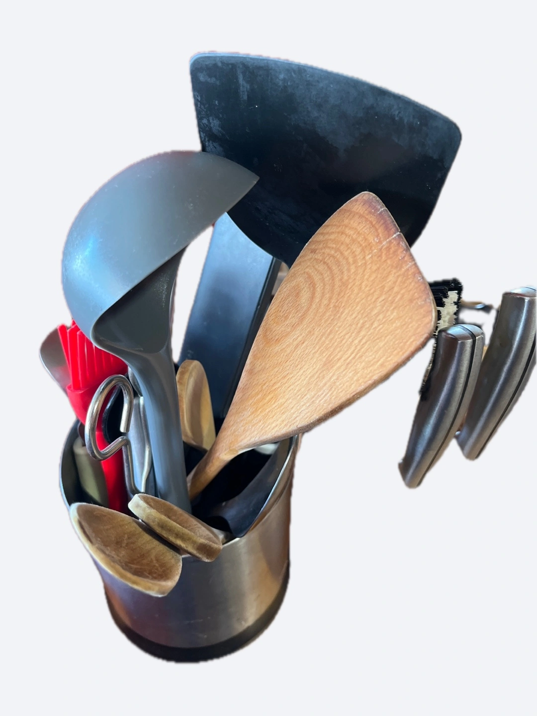 Selling a kitchen utensil set and a knife block. The set includes various cooking utensils and a wooden knife block with knives. Great for anyone setting up a new kitchen or looking to upgrade their current tools!