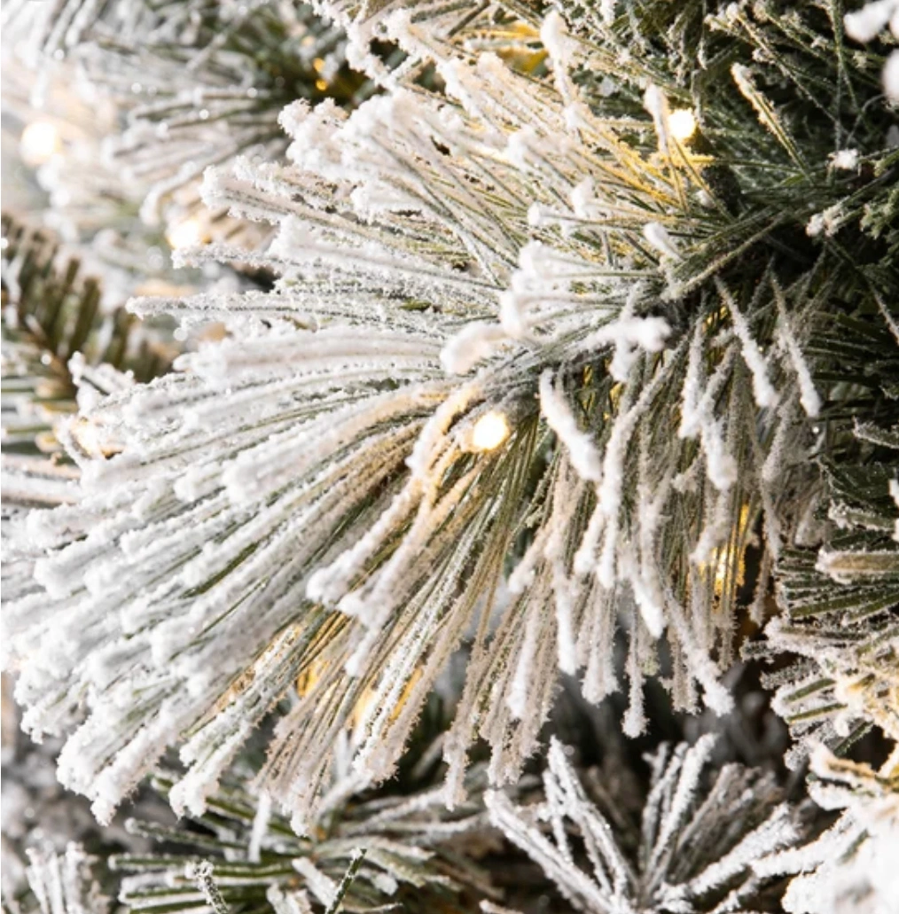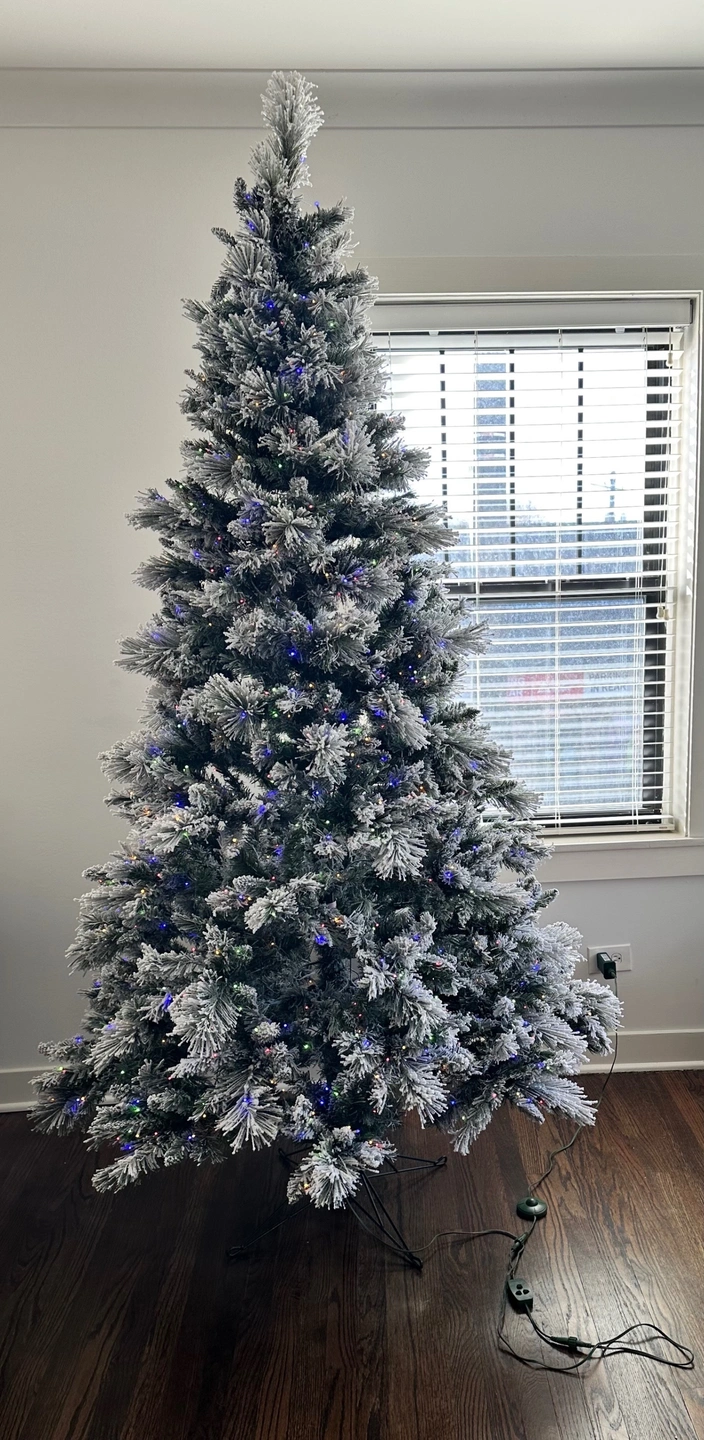 7.5 ft Pre-Lit Flocked Glitter Artificial Christmas Tree with lightly flocked cashmere branch tips and a glittery finish. 1,150 Radiant Micro LED® Lights that have 5 different light functions (clear steady, clear fading, color steady, color fading, and clear & color fading) and 13 brightness levels to choose from and EZ Connect Technology. Comes with a remote controller, light controller, foot pedal switch and metal stand. Tree still in original box.