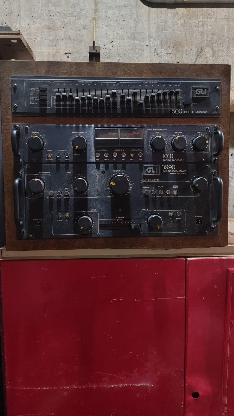 This is a rack-mounted audio setup including a GLI 1500 Bi-FET Equalizer. It also has a GLI 1010 Audio Processor and a GLI 3990 Preamplifier/Mixer. This equipment is designed for broadcast or disco use.
