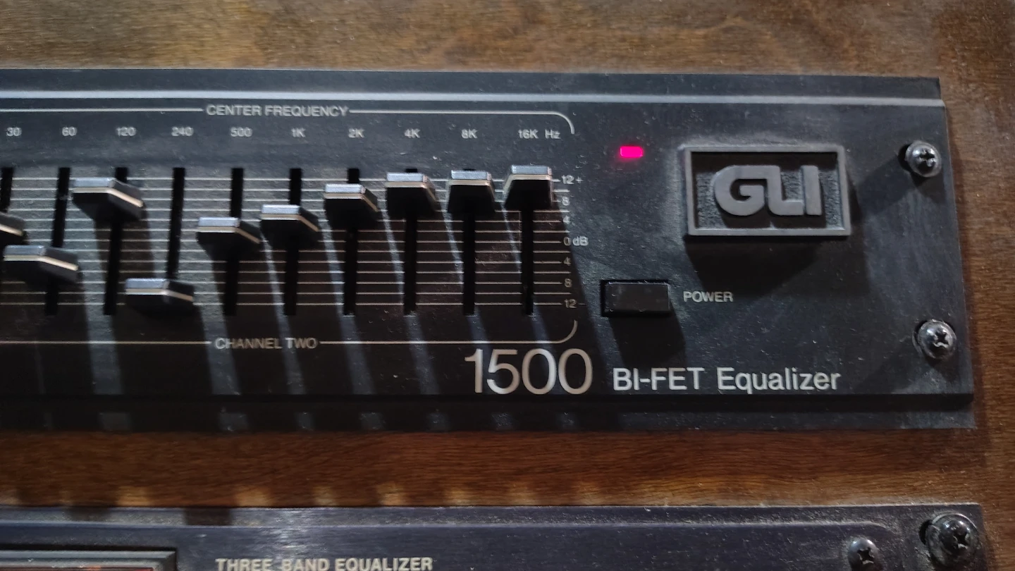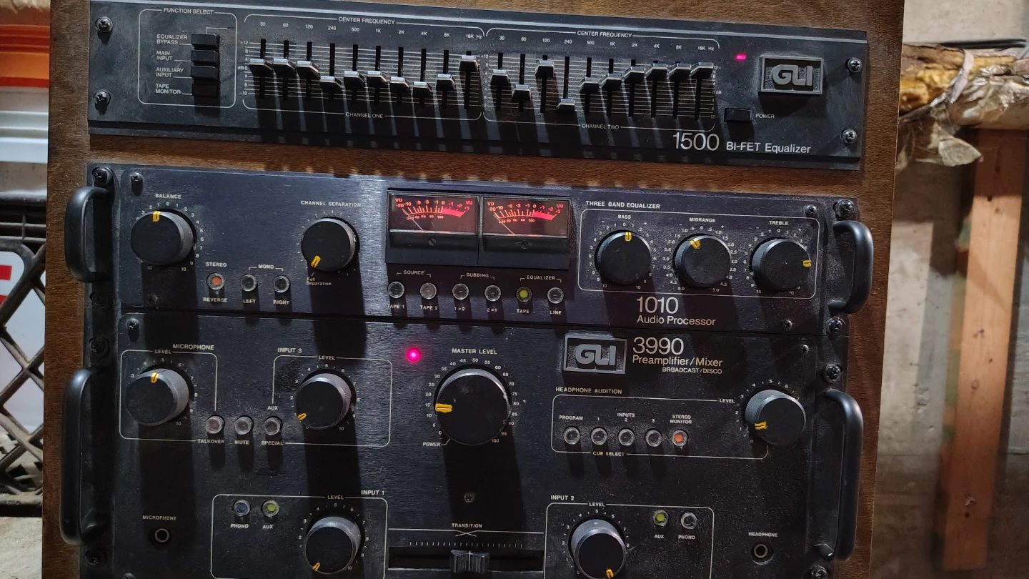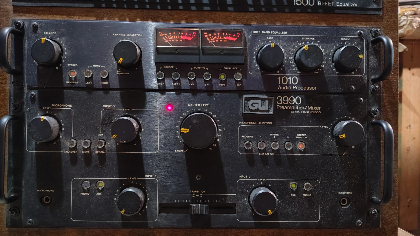 This is a rack-mounted audio setup including a GLI 1500 Bi-FET Equalizer. It also has a GLI 1010 Audio Processor and a GLI 3990 Preamplifier/Mixer. This equipment is designed for broadcast or disco use.