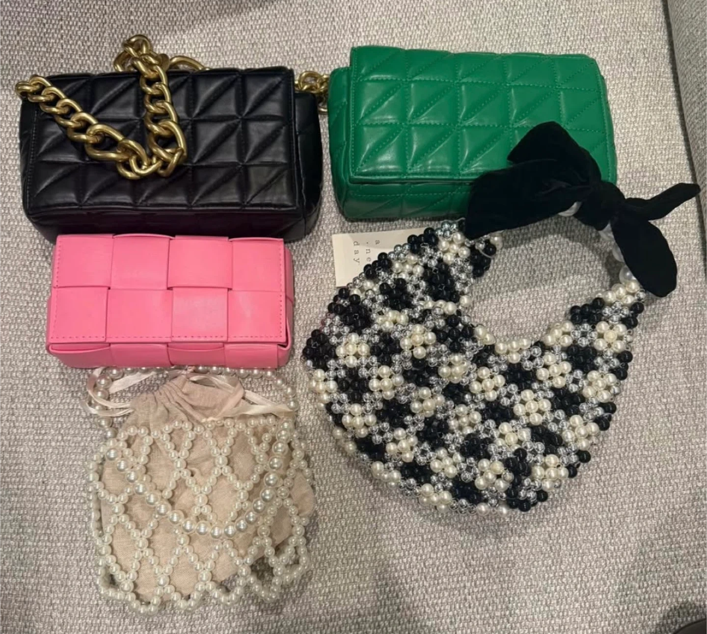 This lot includes four different small handbags. There's a black quilted bag with a chunky gold chain, a bright pink woven clutch, a vibrant green quilted shoulder bag, and a unique black and white beaded mini bag. A small pearl-embellished drawstring pouch is also included. These stylish accessories are perfect for adding a pop of color or texture to any outfit!