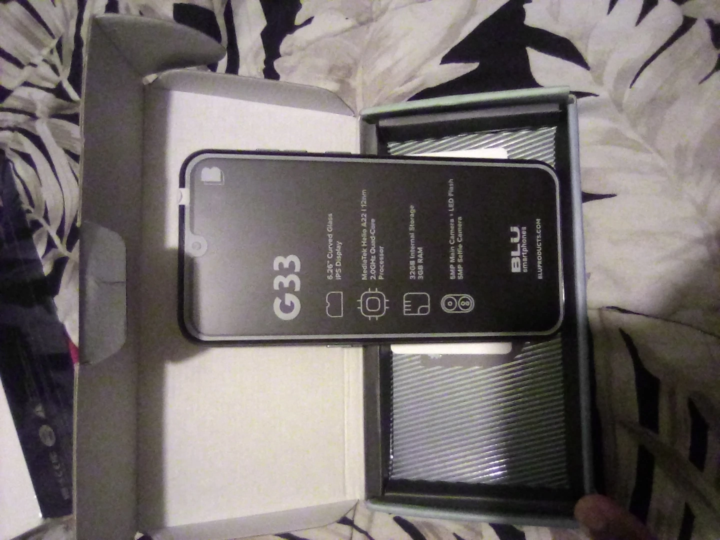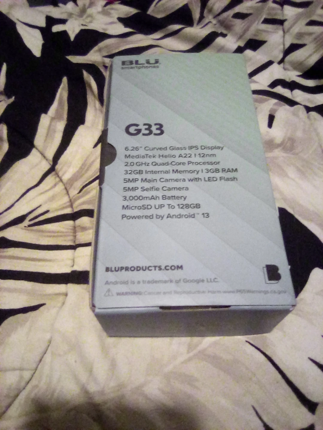 BLU G33 smartphone. It's powered by Android 13 and has a 6.26" curved glass IPS display. It's equipped with a MediaTek Helio A22 processor, 3GB RAM, and 32GB internal storage. The battery is 3,000mAh and it supports microSD up to 128GB.