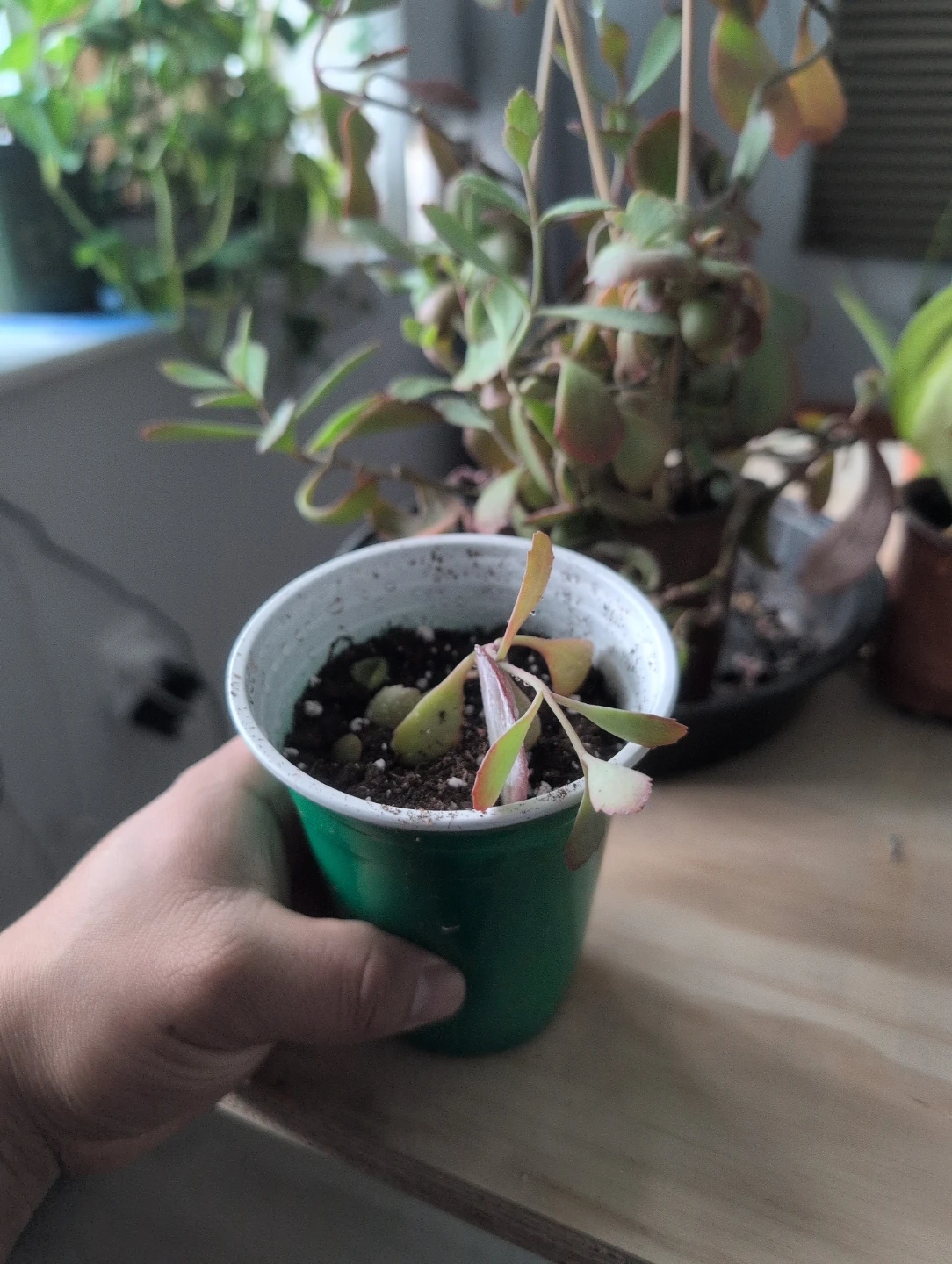 This is a succulent plant cutting in a small green pot. It's ready for a new home and some TLC. The pot is approximately 3 inches tall.