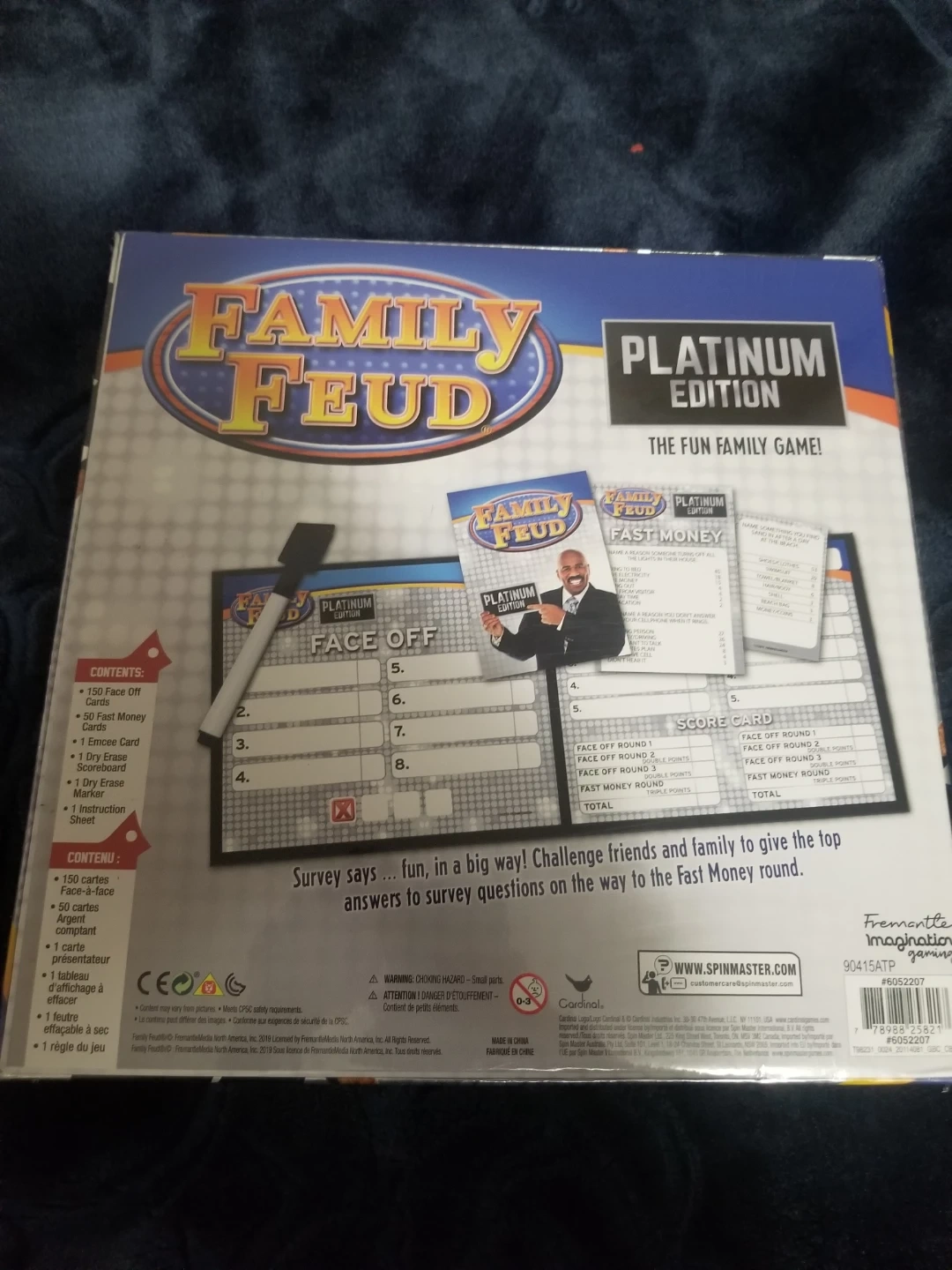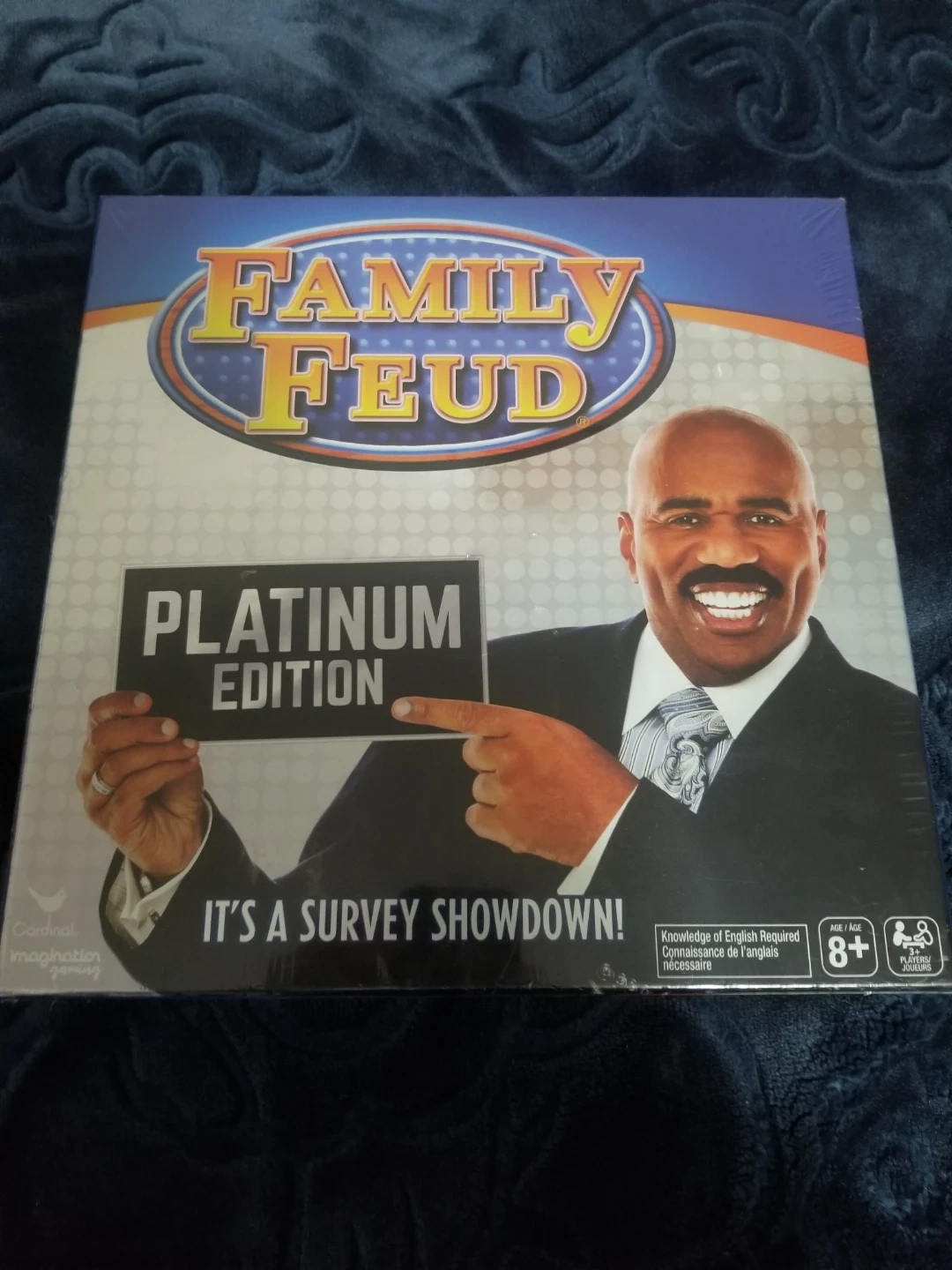 Selling a brand new, sealed Family Feud Platinum Edition board game. It's the fun family game! It's a survey showdown! Includes 150 face off cards, 50 fast money cards, 1 score card, 1 dry erase marker, 1 dry erase scoreboard, and 1 instruction sheet (BRAND NEW NEVER OPENED OR USED)