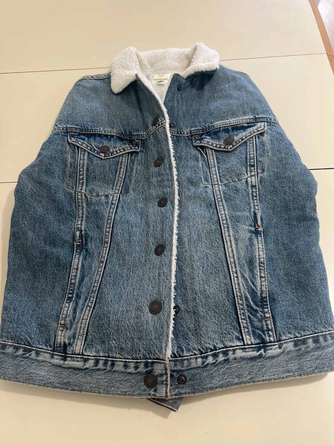 Here's a Free People denim jacket with a cozy faux sherpa collar! It's a classic denim jacket with a fun, soft twist. Perfect for adding a bit of warmth and style to any outfit