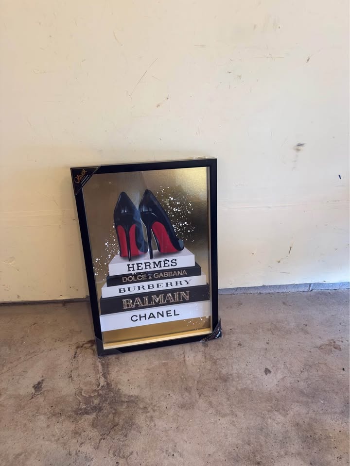 Elegant luxury fashion wall art featuring iconic designer brands (Hermès, Dolce & Gabbana, Burberry, Balmain, Chanel) with high-heel artwork. Perfect for a closet, boutique, salon, office, or modern home décor.