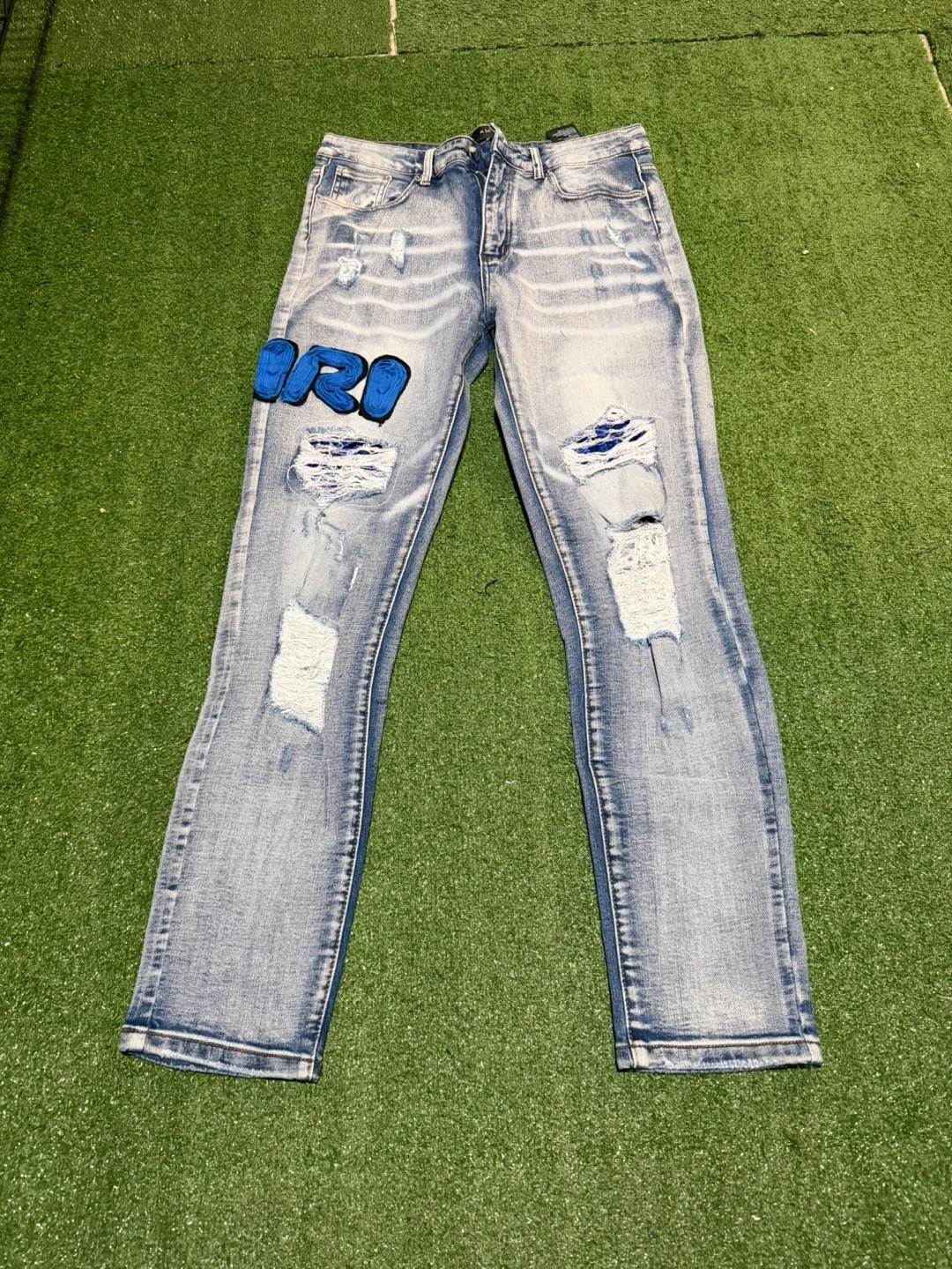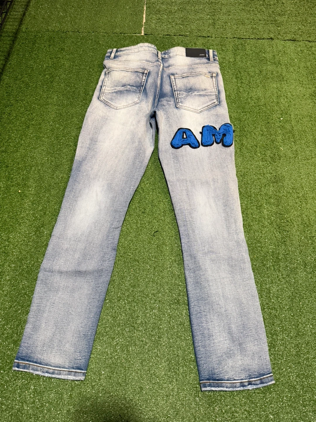 These Amiri jeans feature a light wash denim with distressed detailing and blue "AMIRI" lettering on the back leg. They have a classic five-pocket style and a button-fly closure. Comfortable and stylish for everyday wear.