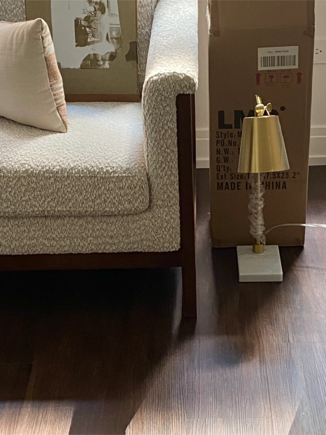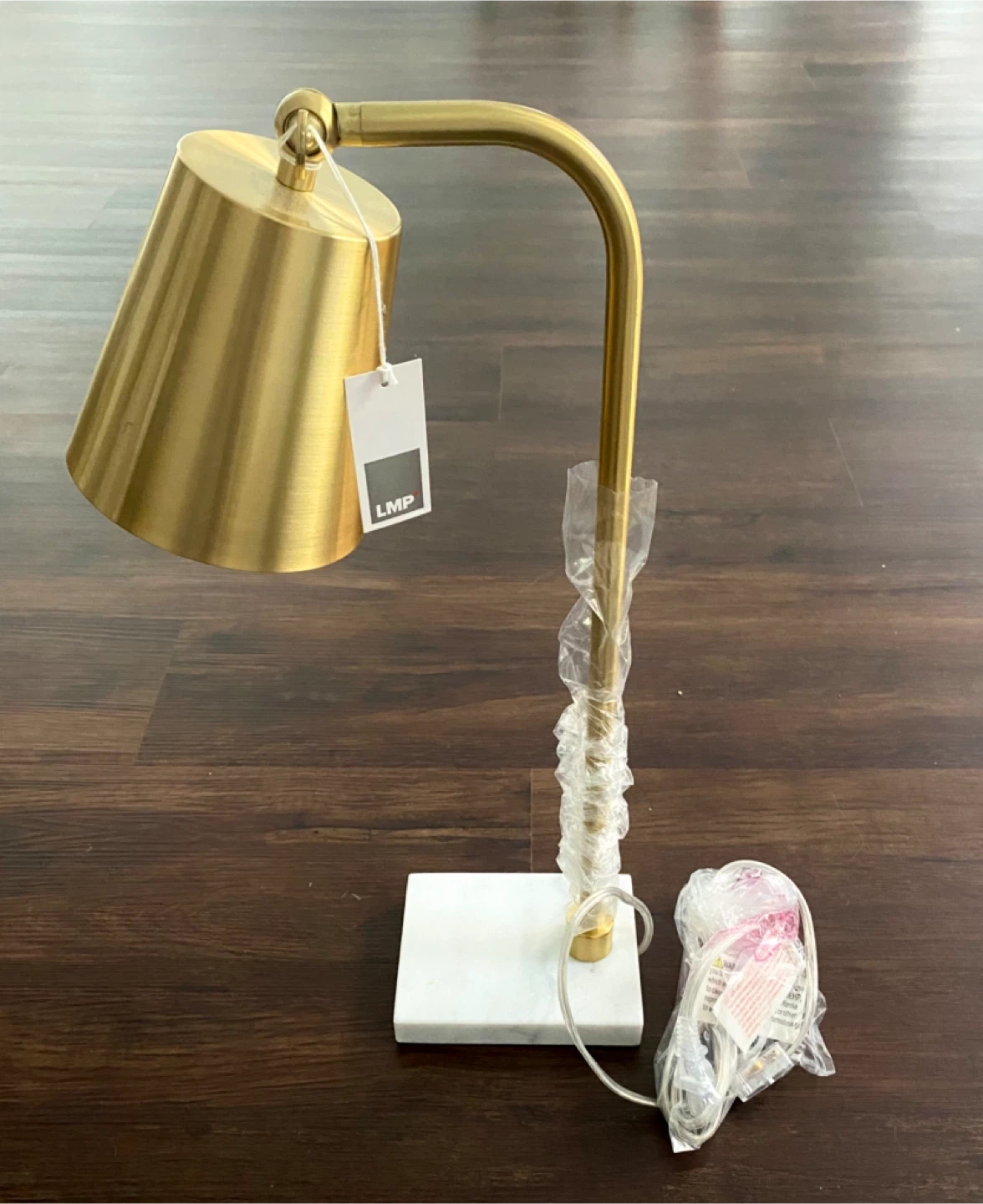 Selling a stylish Sophi table lamp with gold finish. It has a marble base and comes with the original box. The lamp's base is 6”w, and overall 9” diam. x 20”h. Switch is 3-Way. Perfect for adding a touch of elegance to any room!