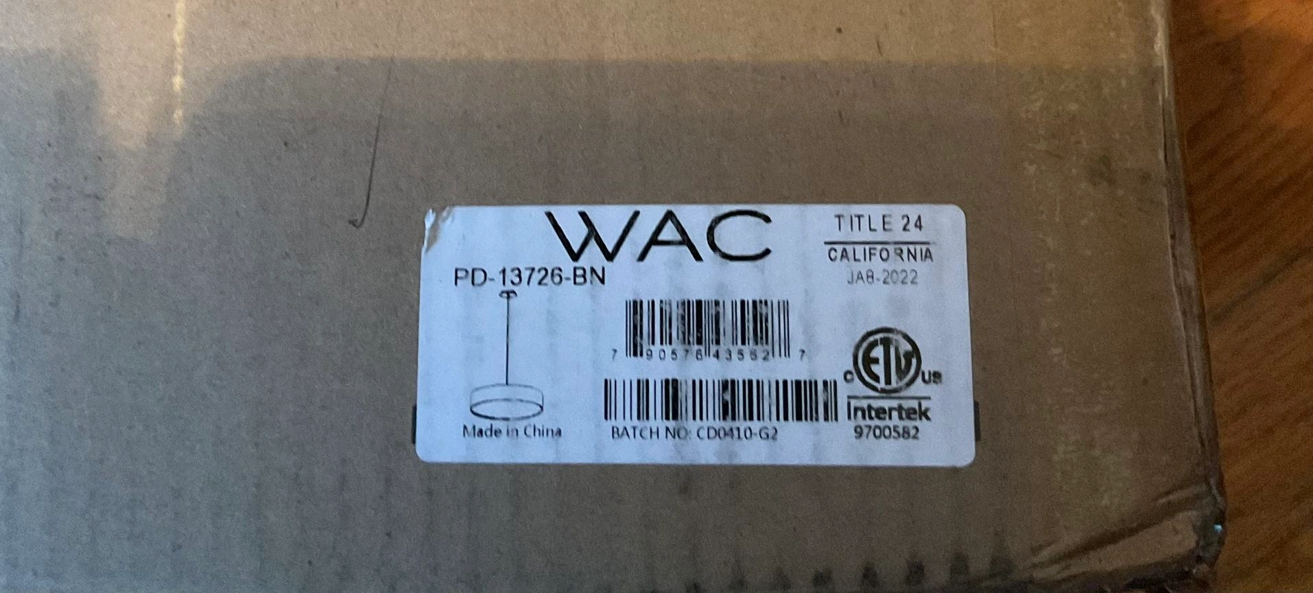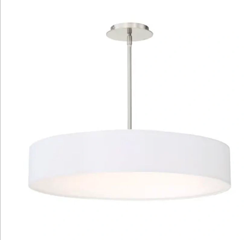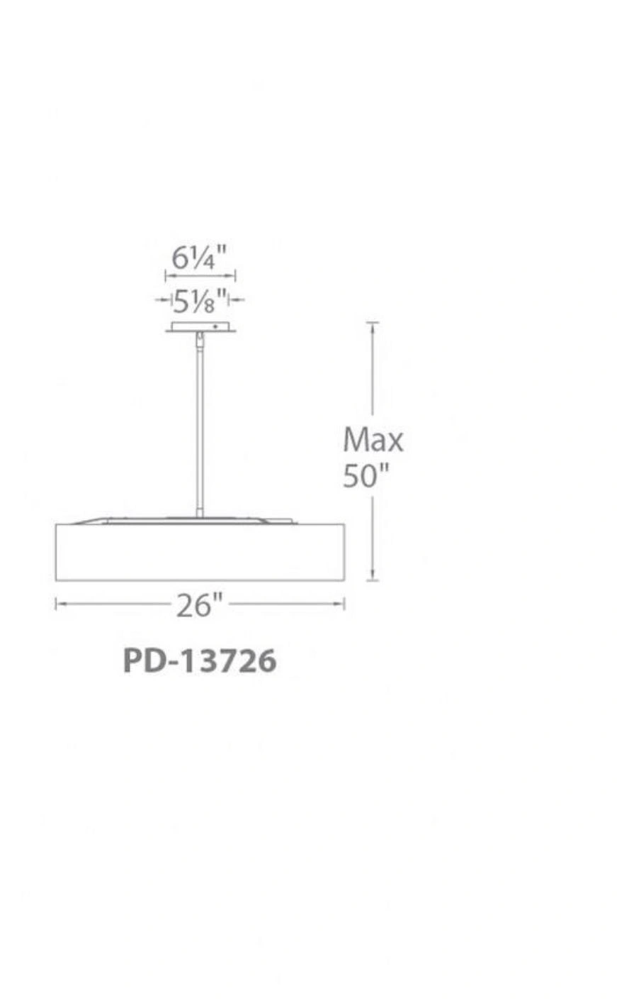 New - Opened only to inspect items Features Aluminum construction Aged Brass and Brushed Nickel finishes feature a white fabric shade Integrated 48 watt LED lighting Dimmable with electronic low voltage (ELV) or TRIAC dimmer switches ETL rated for damp locations Dimensions Fixture Height: 3-3/4" Maximum Hanging Height: 50" Width: 26" Extension: 26" Product Weight: 11.75 lbs Canopy Height: 2" Canopy Width: 6-1/4" Electrical Specifications Lumens: 3419 Color Temperature: 2700K Color Rendering Index: 90 CRI Wattage: 48 watts Average Hours: 50000