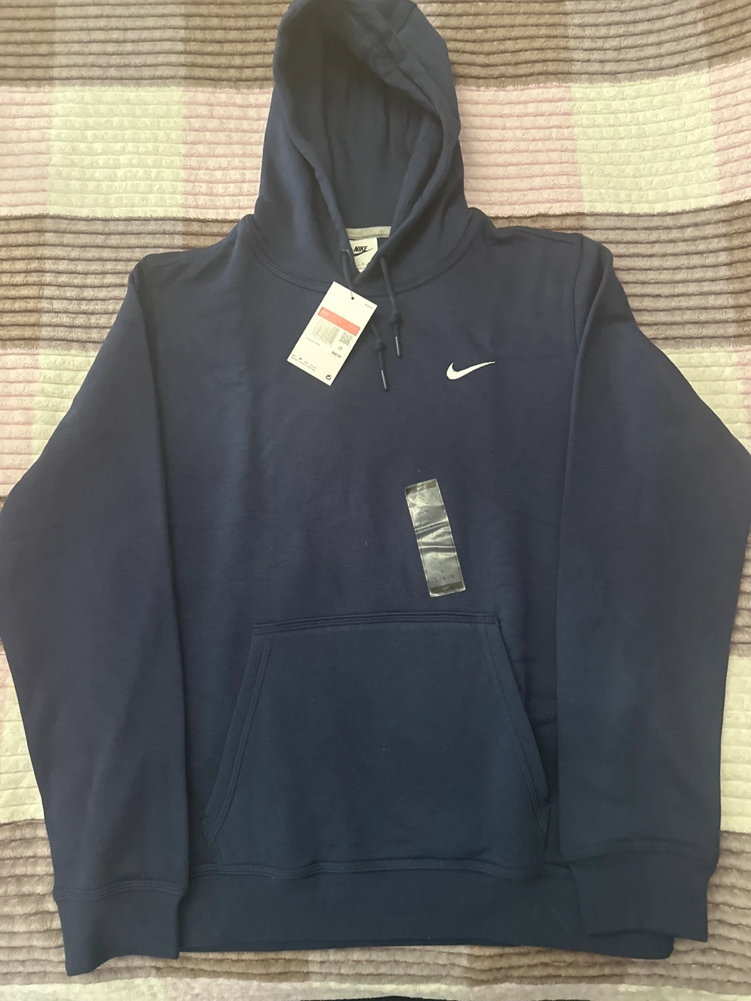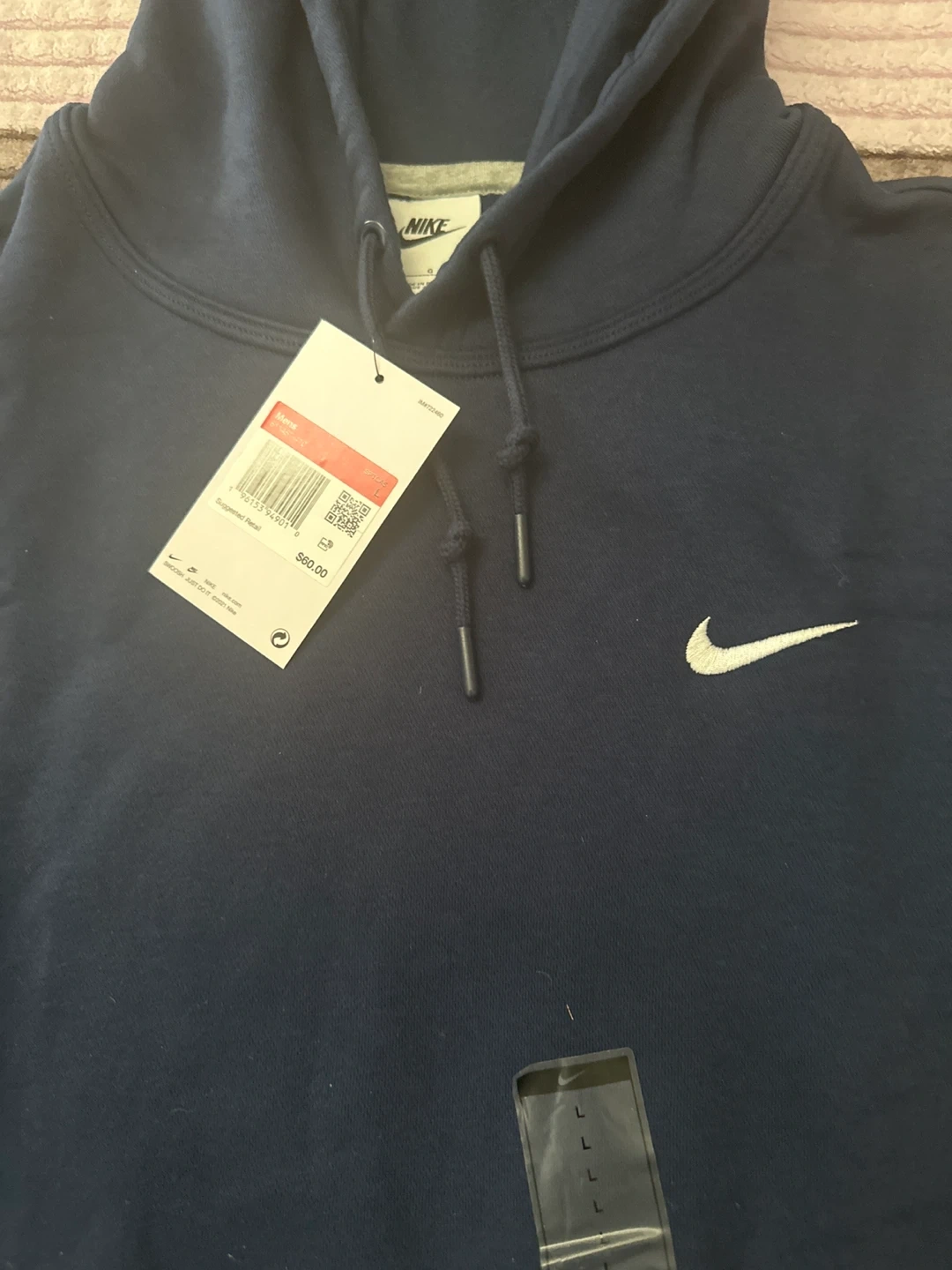 I'm selling a Nike hoodie in a nice navy blue color. It's a size large. The hoodie features the classic Nike swoosh logo. Originally bought for $60!