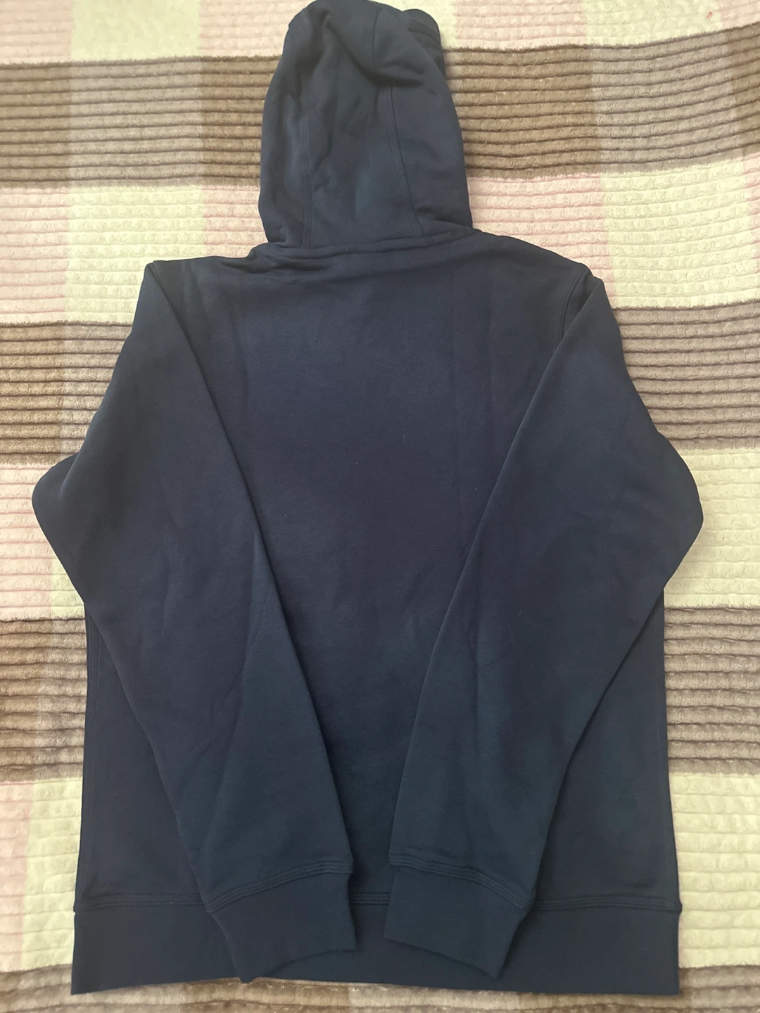 I'm selling a Nike hoodie in a nice navy blue color. It's a size large. The hoodie features the classic Nike swoosh logo. Originally bought for $60!