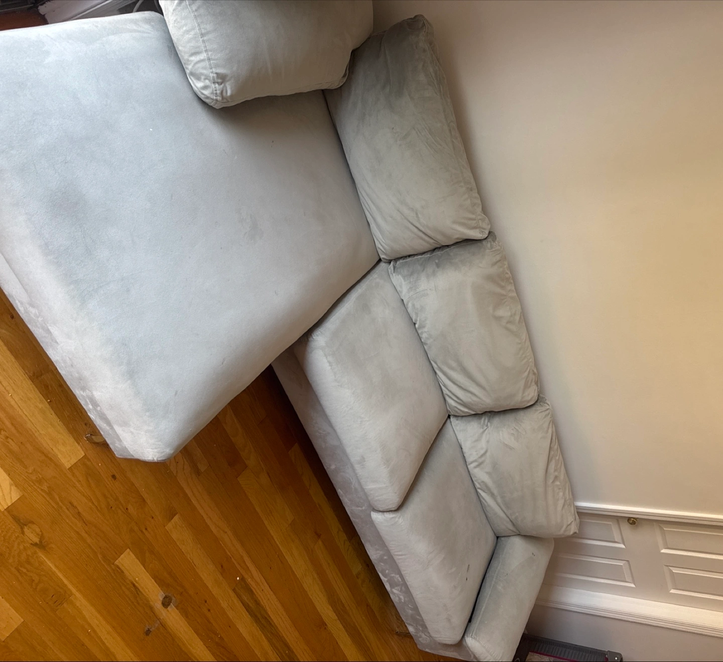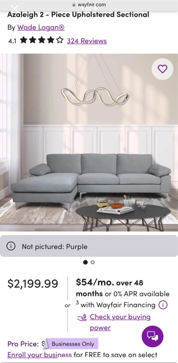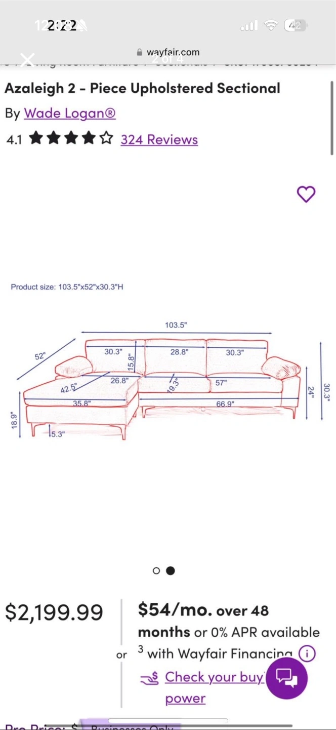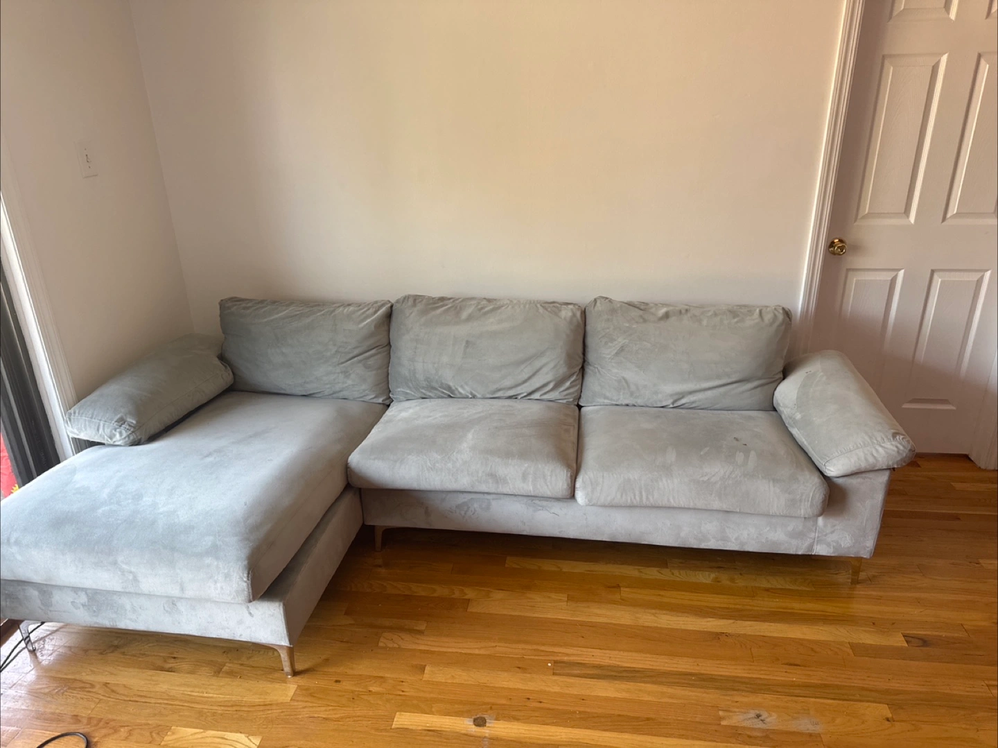 Selling a Wade Logan Azaleigh 2-Piece Upholstered Sectional in great condition! The product size is 103.5"x52"x30.3"H. Originally bought for $2,199.99. It’s suede in texture and needs a new loving home.